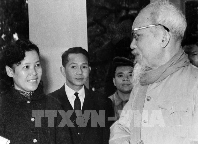 Chủ tịch Hồ Chí Minh dặn dò nữ phóng viên Tuệ Oanh của Việt Nam Thông tấn xã về cách viết tin trong dịp đưa tin cuộc bầu cử Quốc hội khóa III (26/4/1964). Ảnh: Tư liệu TTXVN