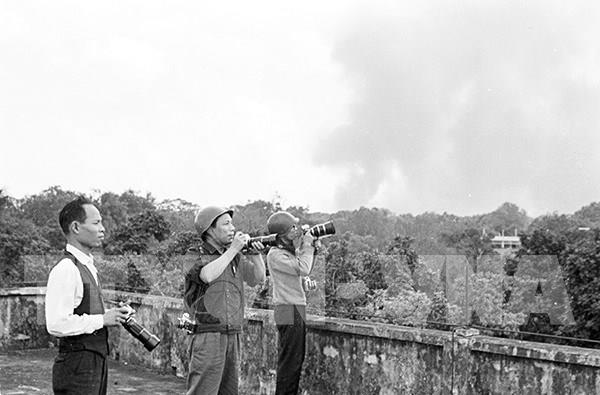 Trong công cuộc kháng chiến cứu quốc, đội ngũ đông đảo những người làm báo của TTXVN đã thực sự là những nhà báo – chiến sĩ. Với hơn 260 liệt sỹ, TTXVN là cơ quan báo chí có số nhà báo hy sinh nhiều nhất trong số các cơ quan báo chí cả nước. Trong ảnh: Phóng viên Việt Nam Thông tấn xã (nay là TTXVN) tác nghiệp trong trận “Hà Nội - Điện Biên Phủ trên không”, tháng 12/1972. Ảnh: Tư liệu TTXVN