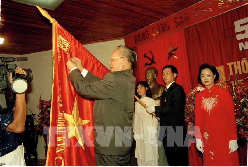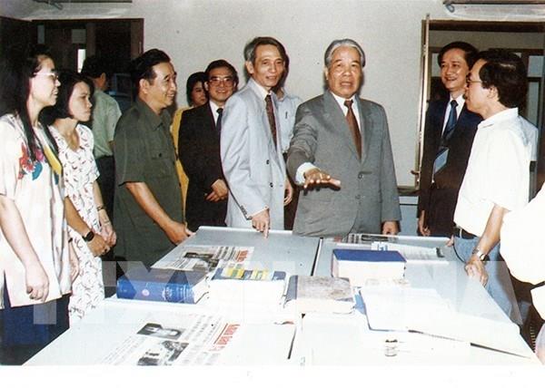 Tổng Bí thư Đỗ Mười thăm Ban biên tập tin Đối ngoại trong chuyến thăm, làm việc với TTXVN, ngày 1/9/1995. Ảnh: Xuân Lâm - TTXVN