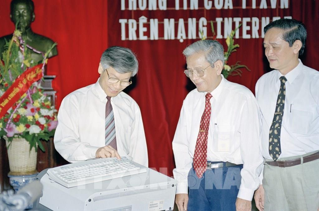 Là một trong những cơ quan báo chí đầu tiên ở Việt Nam hoạt động trên mạng Internet (từ năm 1998), TTXVN hiện cập nhật liên tục tin, bài, ảnh, đồ họa (tĩnh và động) mới nhất, với các phiên bản ngôn ngữ khác nhau trên cổngthông tin chính thức của TTXVN: vnanet.vn. Trong ảnh: Ngày 19/8/1998, Ủy viên Bộ Chính trị, Bí thư Thành ủy Hà Nội Nguyễn Phú Trọng (bên trái) đến dự lễ và ấn nút khai trương thông tin của TTXVN trên mạng Internet. Ảnh: Nguyễn Dân - TTXVN