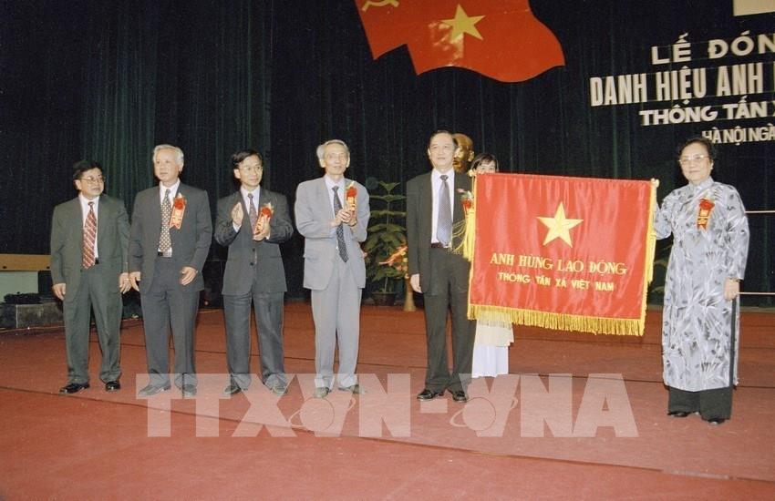 TTXVN là cơ quan báo chí đầu tiên vinh dự được Đảng và Nhà nước trao tặng hai Danh hiệu Anh hùng: Anh hùng Lực lượng vũ trang nhân dân và Anh hùng Lao động thời kỳ đổi mới; các huân chương cao quý: Huân chương Sao vàng; Huân chương Hồ Chí Minh; Huân chương Độc lập hạng Nhất và nhiều phần thưởng, danh hiệu cao quý. Trong ảnh: Phó Chủ tịch nước Nguyễn Thị Bình trao Danh hiệu Anh hùng Lao động của Chủ tịch nước tặng TTXVN, ngày 21/6/2001. Ảnh: Nguyễn Khang - TTXVN