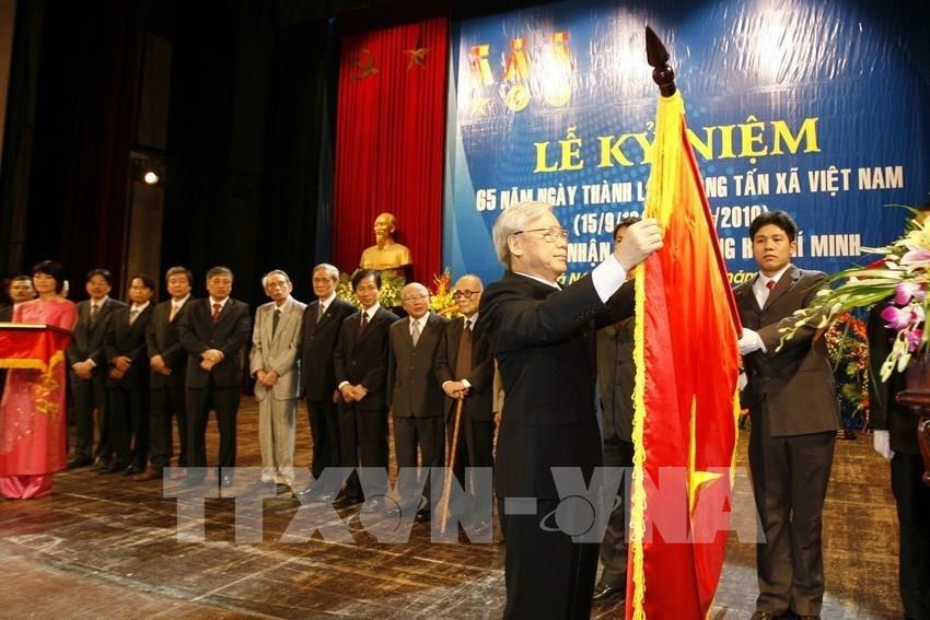 Chủ tịch Quốc hội Nguyễn Phú Trọng trao Huân chương Hồ Chí Minh (lần thứ hai) của Chủ tịch nước tặng TTXVN tại Lễ kỷ niệm 65 năm Ngày thành lập (15/9/1945 - 15/9/2010). Ảnh: Trí Dũng - TTXVN