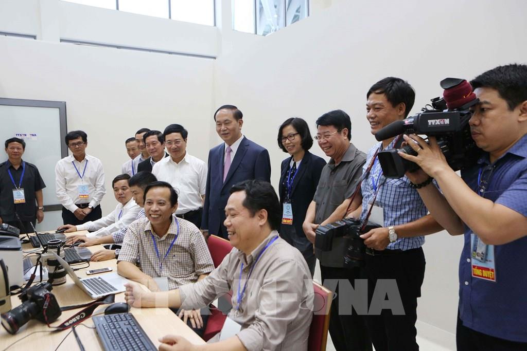 Cách mạng công nghiệp 4.0 đang diễn ra mạnh mẽ, với sự phát triển công nghệ truyền thông mới, báo chí cũng không đứng ngoài cuộc. Điều này tạo ra những thuận lợi cũng như thách thức cho các cơ quan báo chí và những người làm báo Việt Nam. Trong ảnh: Chủ tịch nước Trần Đại Quang với cán bộ, phóng viên, biên tập viên TTXVN tham dự, đưa tin các hoạt động của Tuần lễ Cấp cao APEC 2017, chiều 29/10/2017, tại thành phố Đà Nẵng. Ảnh: TTXVN