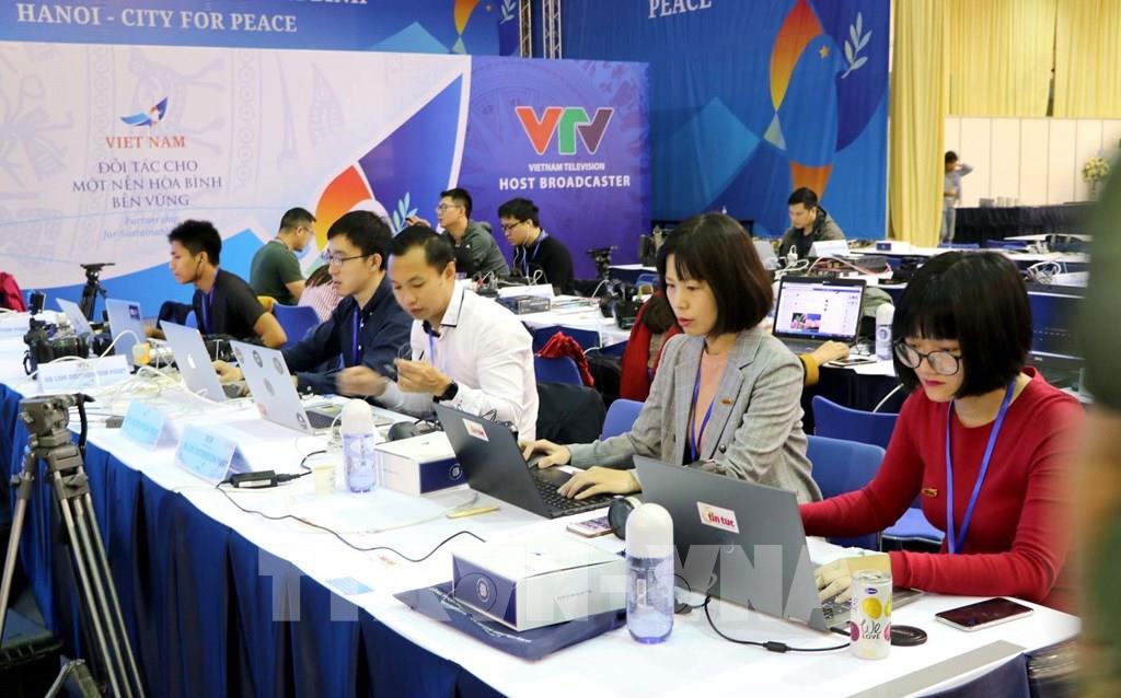 Phóng viên Thông tấn xã Việt Nam liên tục cập nhật thông tin trước giờ khai mạc Hội nghị Thượng đỉnh Mỹ - Triều Tiên lần thứ hai, ngày 27/2/2019, tại Trung tâm Báo chí Quốc tế ở Hà Nội. Ảnh: Minh Đông-TTXVN