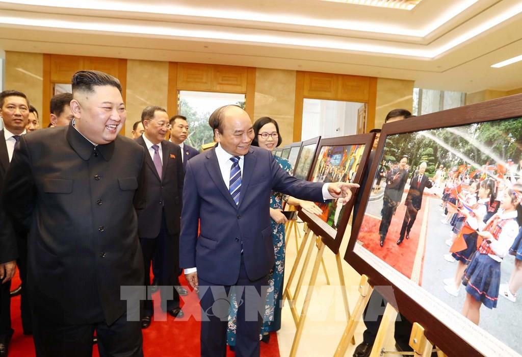 Thủ tướng Nguyễn Xuân Phúc và Chủ tịch Triều Tiên Kim Jong-un tham quan trưng bày ảnh "Quan hệ Việt Nam - Triều Tiên" do TTXVN thực hiện, trong chuyến thăm cấp Nhà nước tới Việt Nam ngày 1/3/2019. Ảnh: Thống Nhất - TTXVN