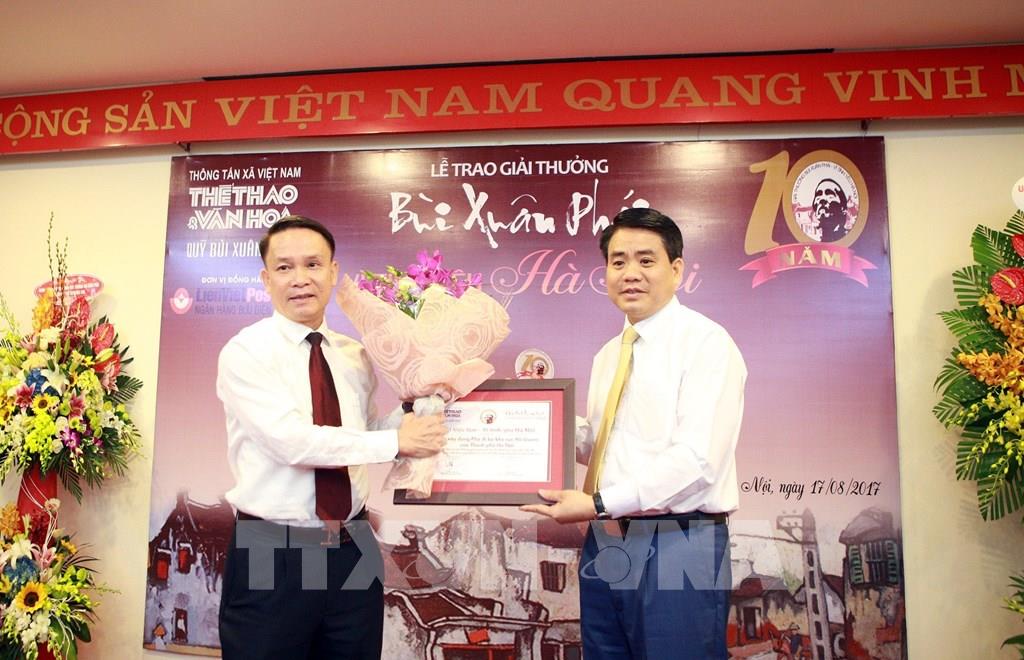 Báo Thể thao & Văn hóa của TTXVN là tờ báo chuyên về lĩnh vực thể thao và văn hóa đầu tiên và hàng đầu ở Việt Nam, Thể thao và Văn hóa còn “ghi dấu ấn” trong lòng công chúng cả nước thông qua các hoạt động tổ chức sự kiện (Giải Âm nhạc Cống hiến, Giải Bùi Xuân Phái - Vì tình yêu Hà Nội...). Trong ảnh: Ông Nguyễn Đức Chung, Chủ tịch UBND TP Hà Nội (bên phải) đại diện Thành phố nhận Giải việc làm – Vì tình yêu Hà Nội cho "Phố đi bộ khu vực Hồ Gươm", tại Lễ trao "Giải Bùi Xuân Phái - Vì tình yêu Hà Nội” lần thứ 10 - năm 2017. Ảnh: Hoàng Hùng – TTXVN