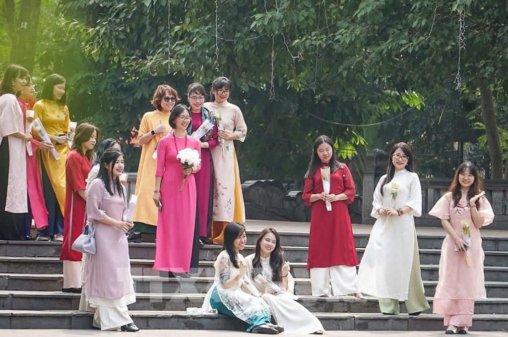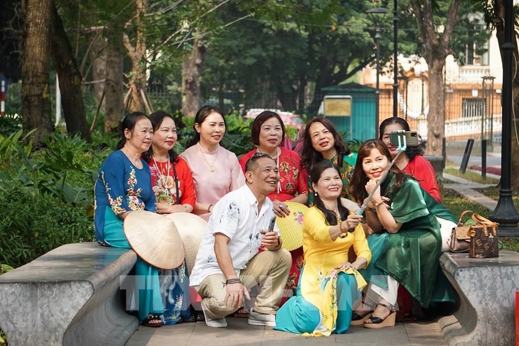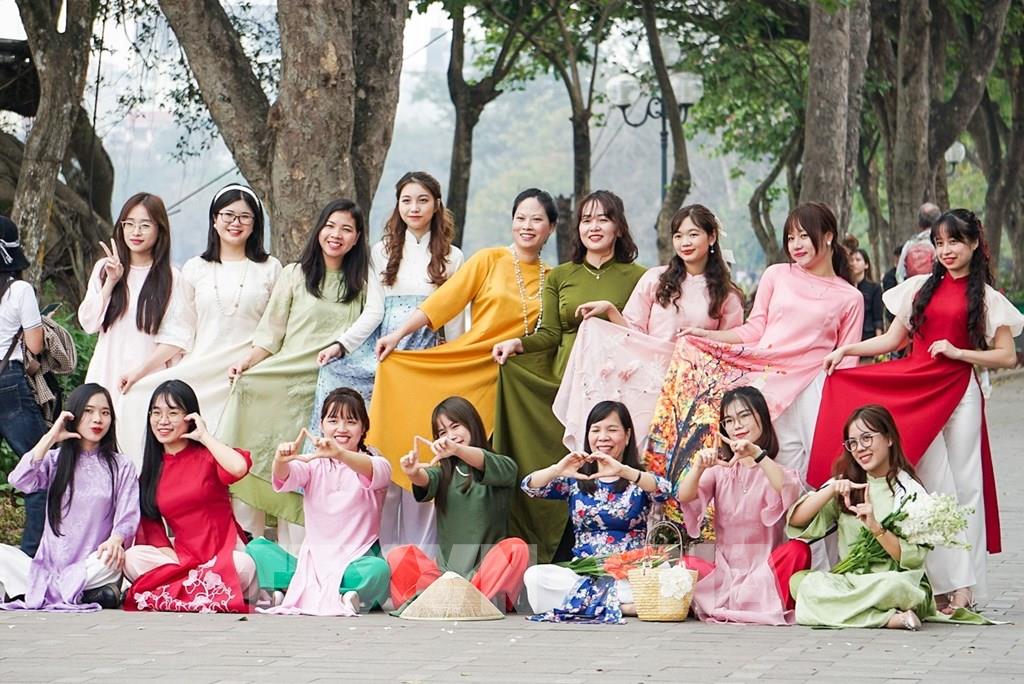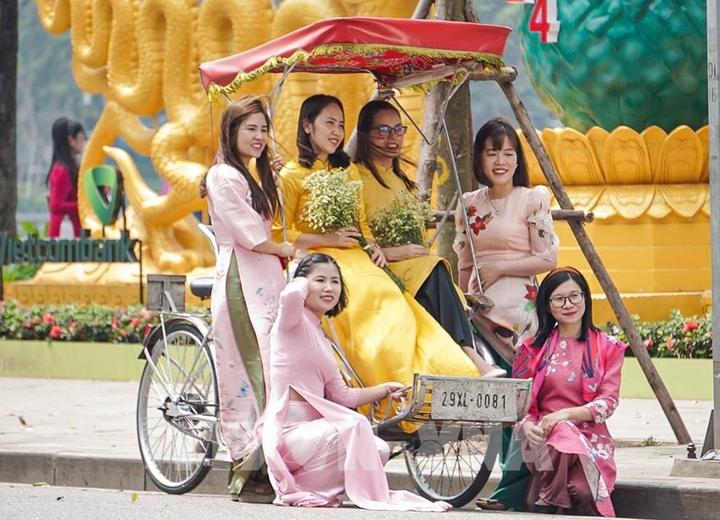 Trong trang phục áo dài, ai cũng muốn lưu lại những hình ảnh đẹp nhất. Ảnh: Khánh Hoà - TTXVN