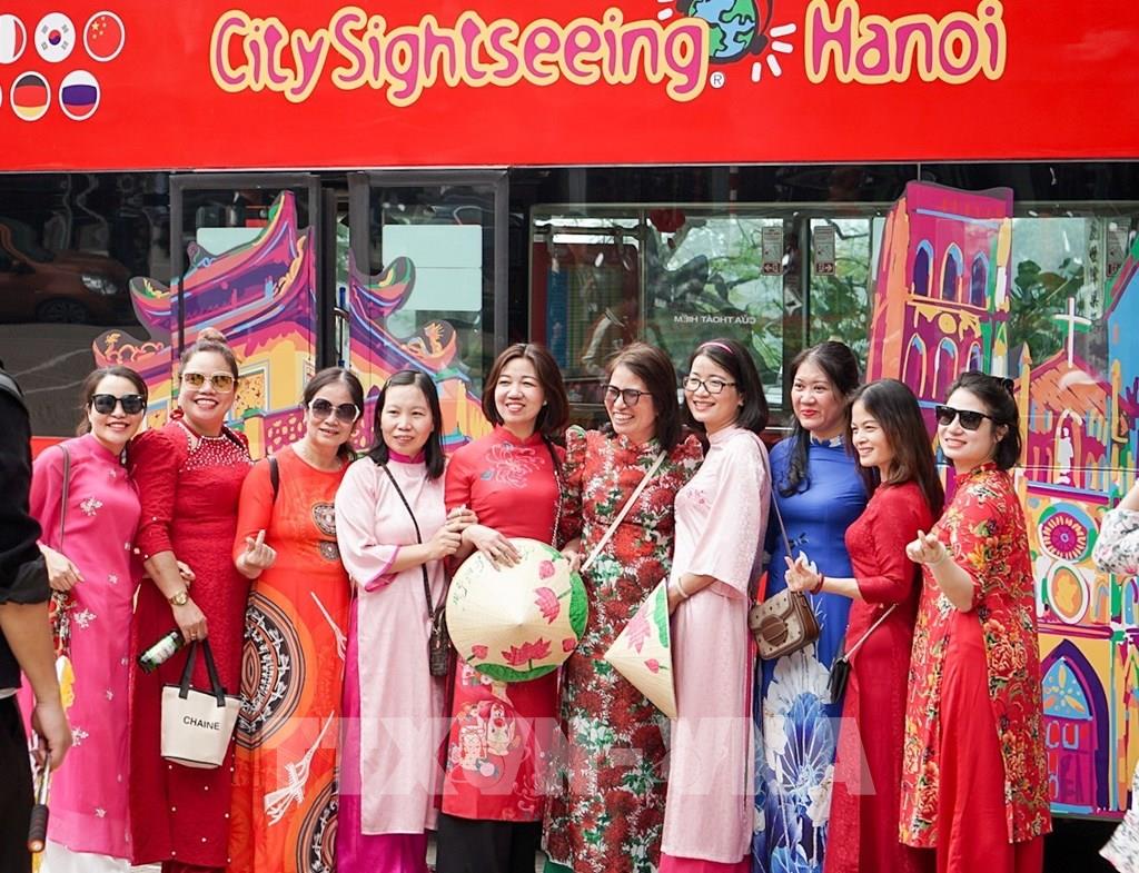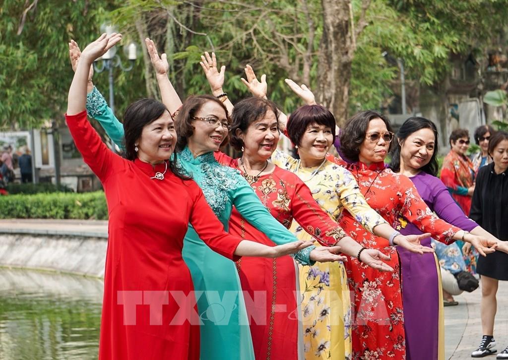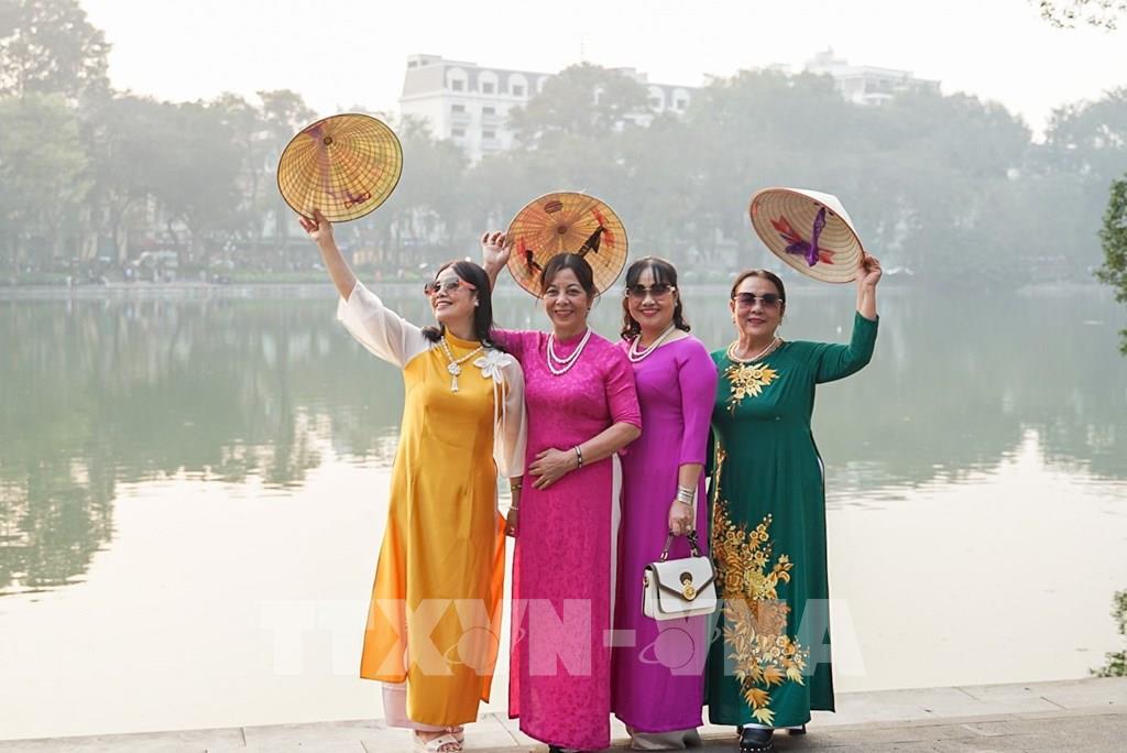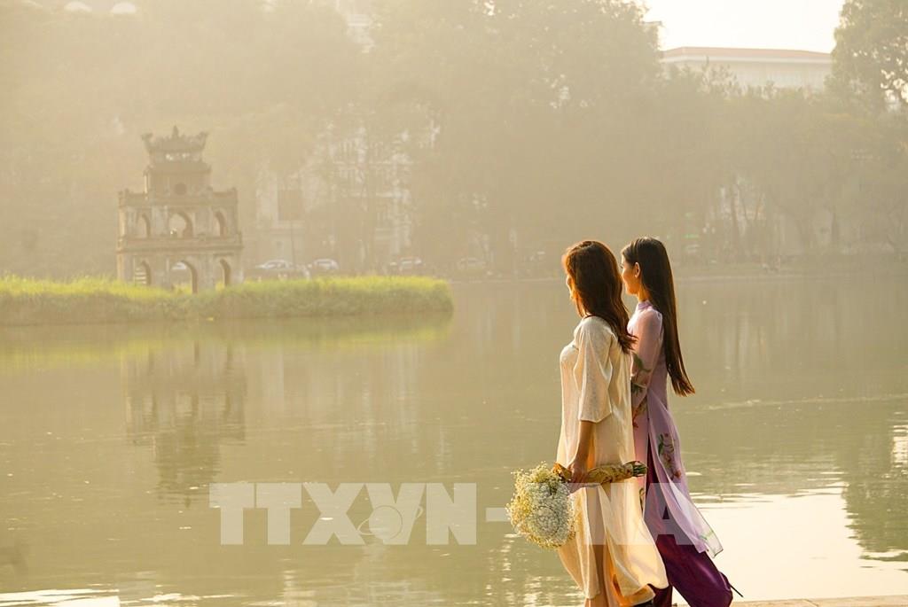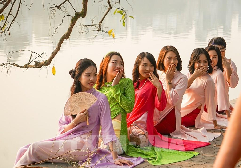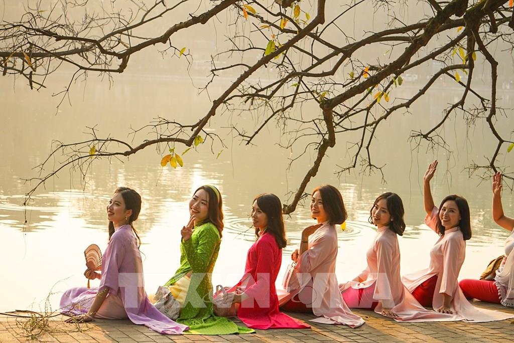Các chị em rạng rỡ trong trang phục áo dài tại hồ Hoàn Kiếm. Ảnh: Khánh Hoà - TTXVN