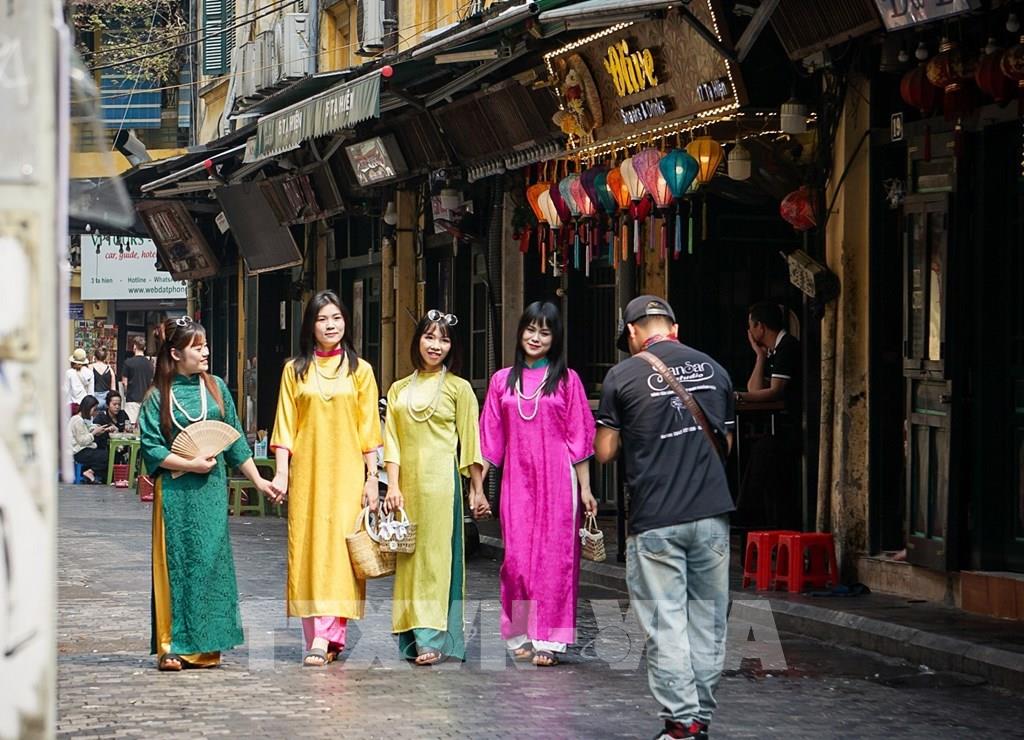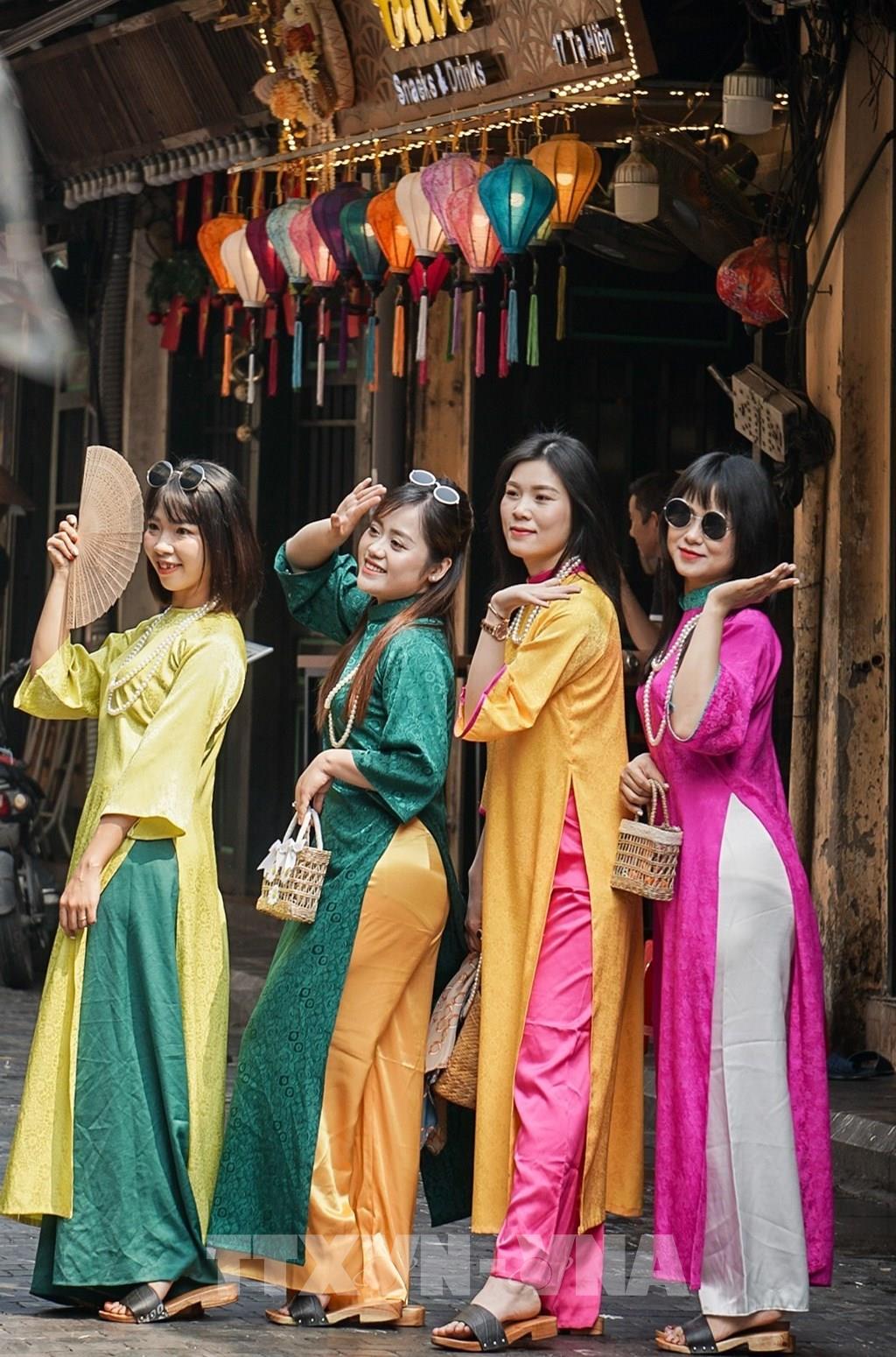 Các thiếu nữ Hà thành với những bộ áo dài rực rỡ trên phố Tạ Hiện, quận Hoàn Kiếm. Ảnh: Khánh Hoà - TTXVN