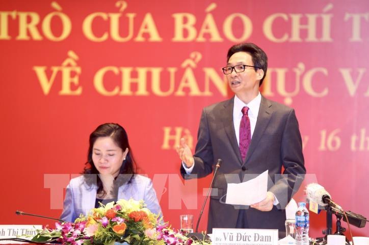 Phó Thủ tướng Vũ Đức Đam và các đại biểu tham quan Triển lãm ảnh báo chí "Cuộc sống thường ngày" tại Hội báo. Ảnh: Minh Quyết - TTXVN