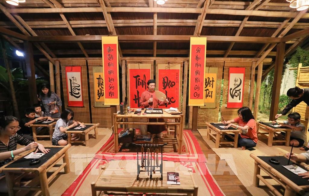 Du khách tham gia hoạt động trải nghiệm tại Văn Miếu-Quốc Tử Giám. Ảnh: Hoàng Hiếu - TTXVN
