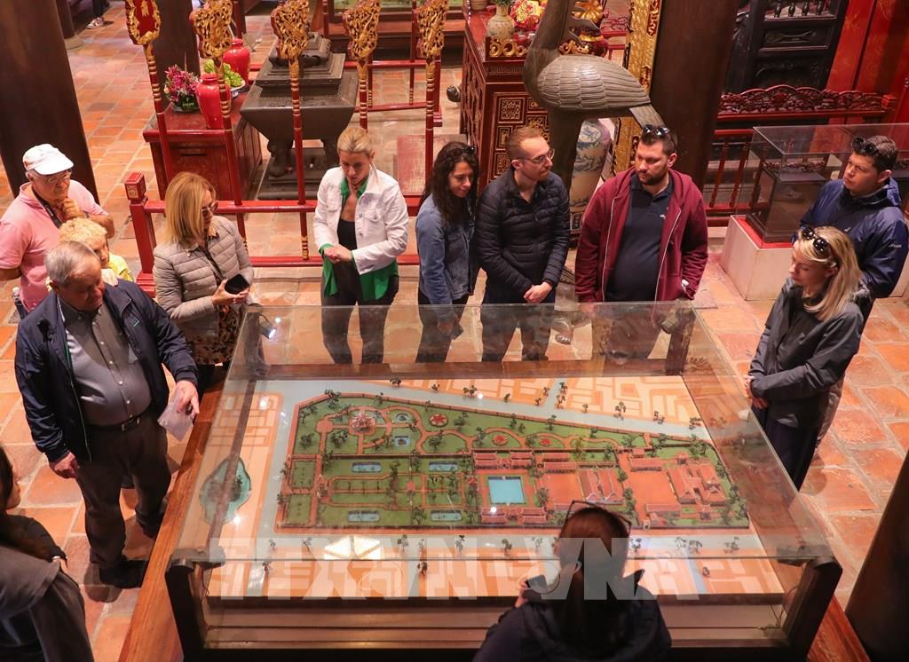 Du khách tham quan mô hình Văn Miếu - Quốc Tử Giám. Ảnh: Hoàng Hiếu - TTXVN