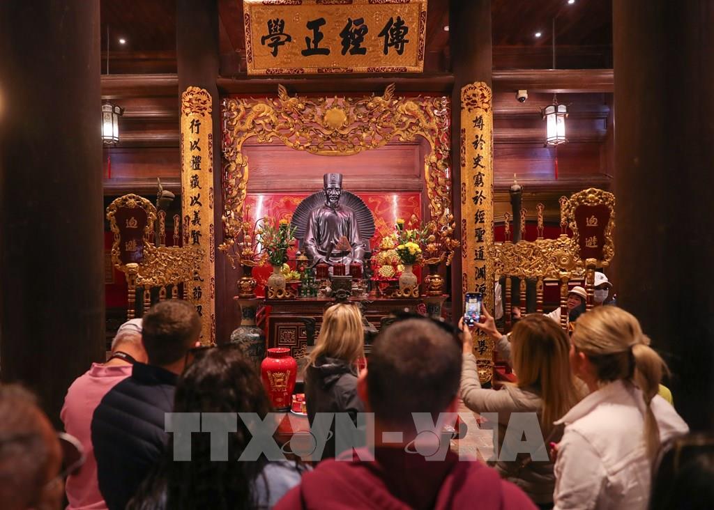 Du khách tại Hậu đường của khu Thái học, nơi đặt tượng Tư nghiệp Quốc Tử Giám Chu Văn An làm bằng đồng, cao 2,3m, nặng khoảng 3 tấn. Ảnh: Hoàng Hiếu - TTXVN