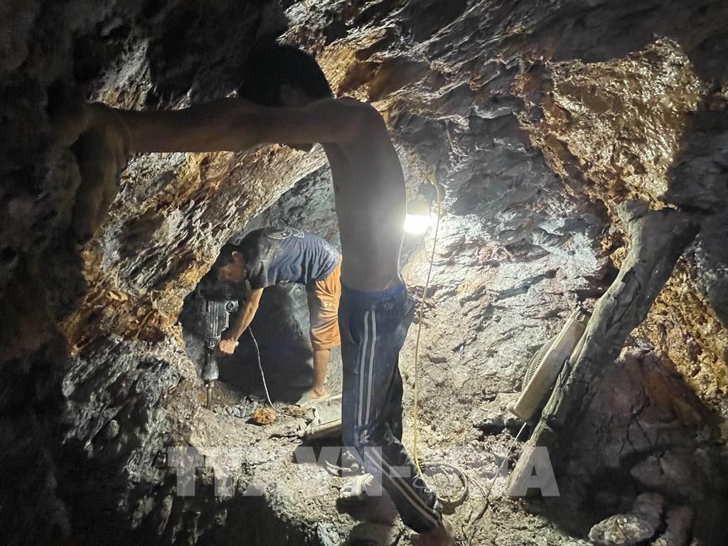Những phu vàng làm việc trong các hầm đào vàng sâu hun hút tại điểm Nậm Khá, xã Mù Cả, huyện Mường tè, tỉnh Lai Châu. Ảnh: Nhóm PV TTXVN tại Lai Châu