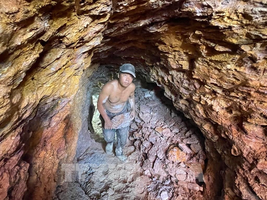 Một phu vàng làm việc trong hầm sâu cực kỳ nguy hiểm. Ảnh: Nhóm PV TTXVN tại Lai Châu