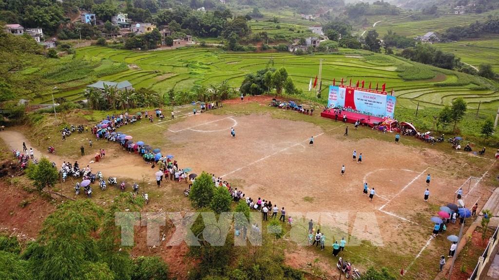 Thi đấu trên sân đất, xung quanh là ruộng bậc thang, núi non trùng điệp cũng là một điểm ấn tượng của Giải bóng đá nữ xã Húc Động (huyện Bình Liêu, tỉnh Quảng Ninh). Ảnh: Thành Đạt - TTXVN