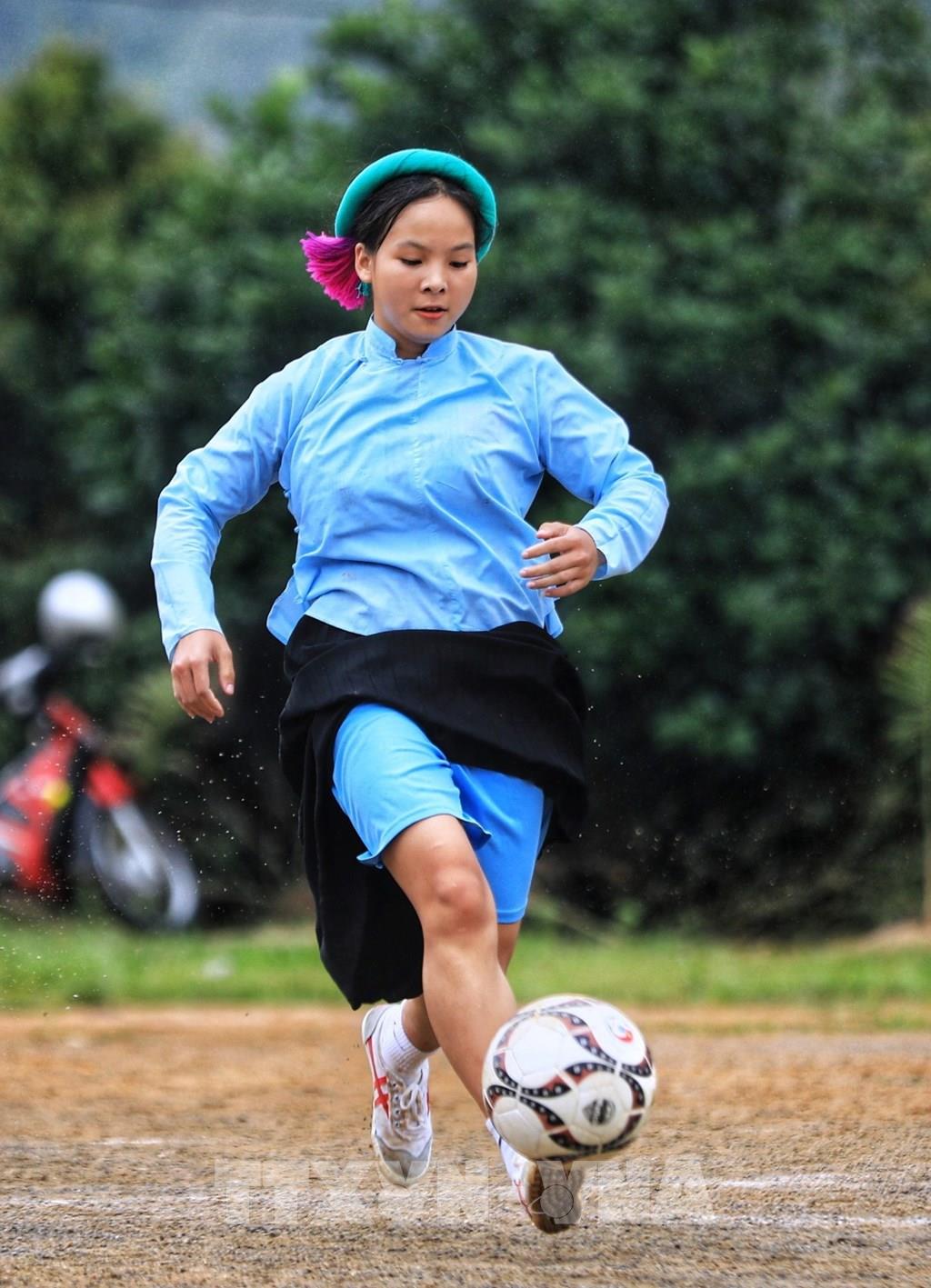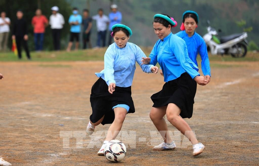 Chứng kiến trận đấu, du khách sẽ thấy được vẻ đẹp duyên dáng cũng như nét cá tính, tinh thần thể thao của những cô gái dân tộc Sán Chỉ mặc váy, vấn khăn đá bóng. Ảnh: Thành Đạt - TTXVN
