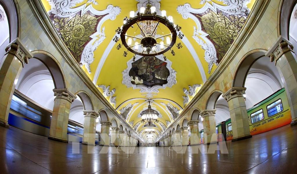 Ga tàu điện ngầm Komsomolskaya được khai trương vào năm 1952, kết hợp với 3 nhà ga đường sắt ở trên mặt đất (Leningradsky, Yaroslavsky và Kazansky) tạo thành cửa ngõ ra vào đông đúc và nhộn nhịp nhất của thủ đô Moskva. Ảnh: Trần Hiếu - Pv TTXVN