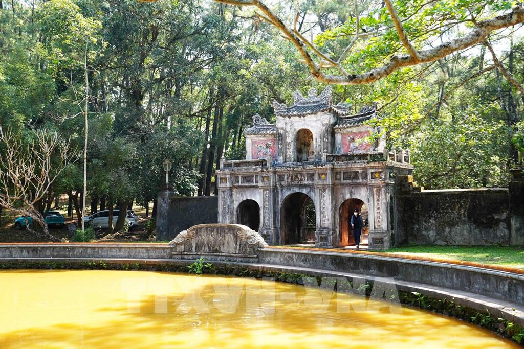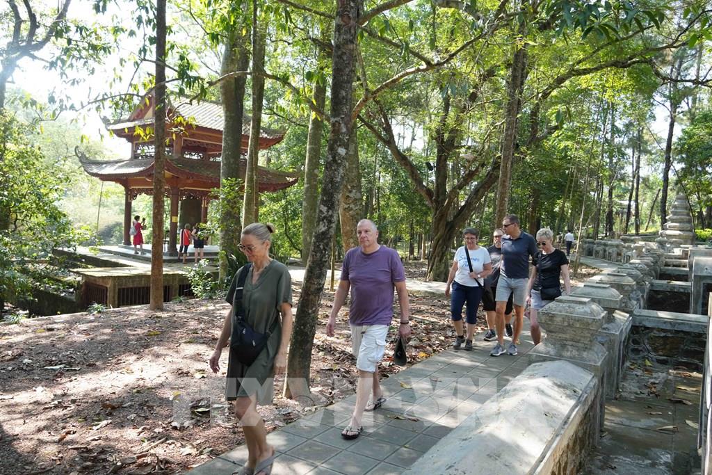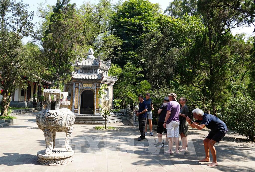 Du khách quốc tế tham quan trong khu vực chùa Từ Hiếu, phường Thủy Xuân, thành phố Huế. Ảnh: Nguyên Lý - TTXVN