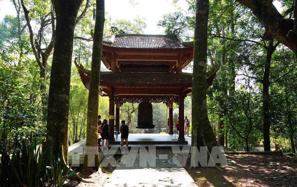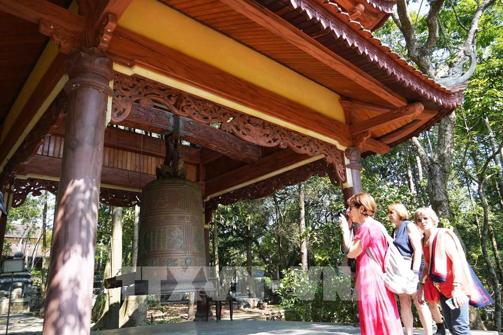 Du khách quốc tế tham quan Tháp Chuông của chùa Từ Hiếu, phường Thủy Xuân, thành phố Huế. Ảnh: Nguyên Lý - TTXVN