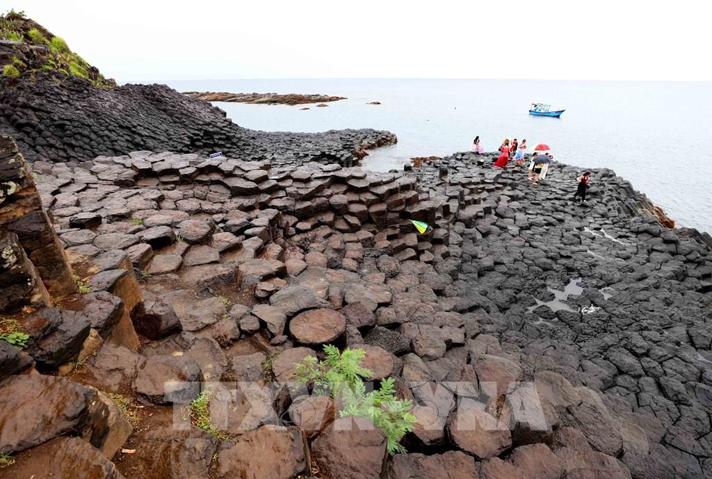 Màu đen huyền của đá bazan tương phản với màu xanh của biển cả, tạo nên một bức tranh thiên nhiên đầy ấn tượng. Ảnh: Thanh Tùng - TTXVN
