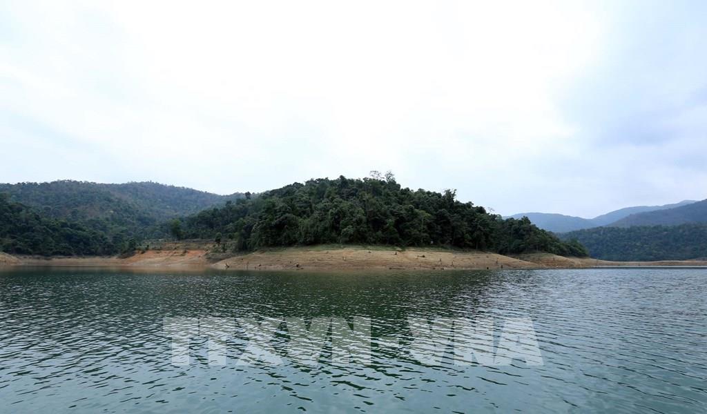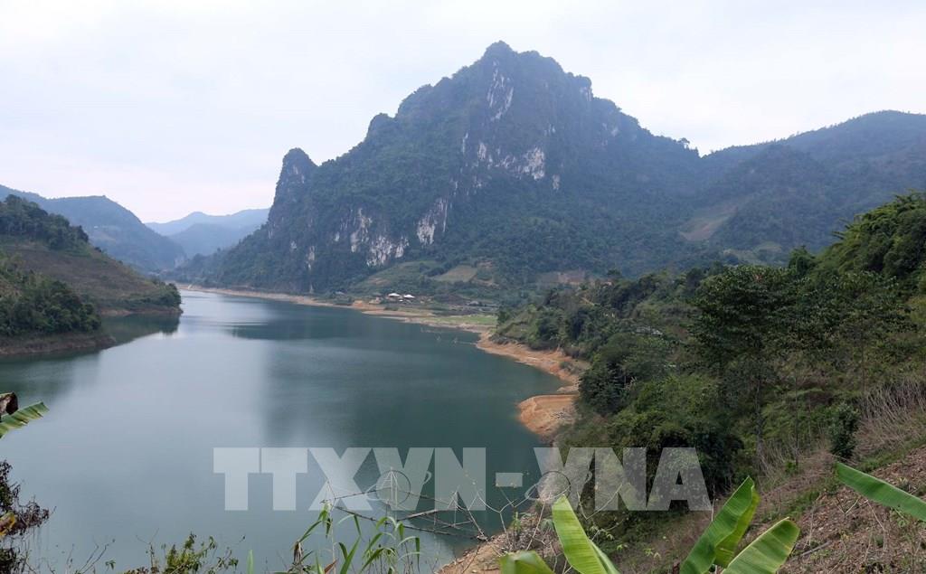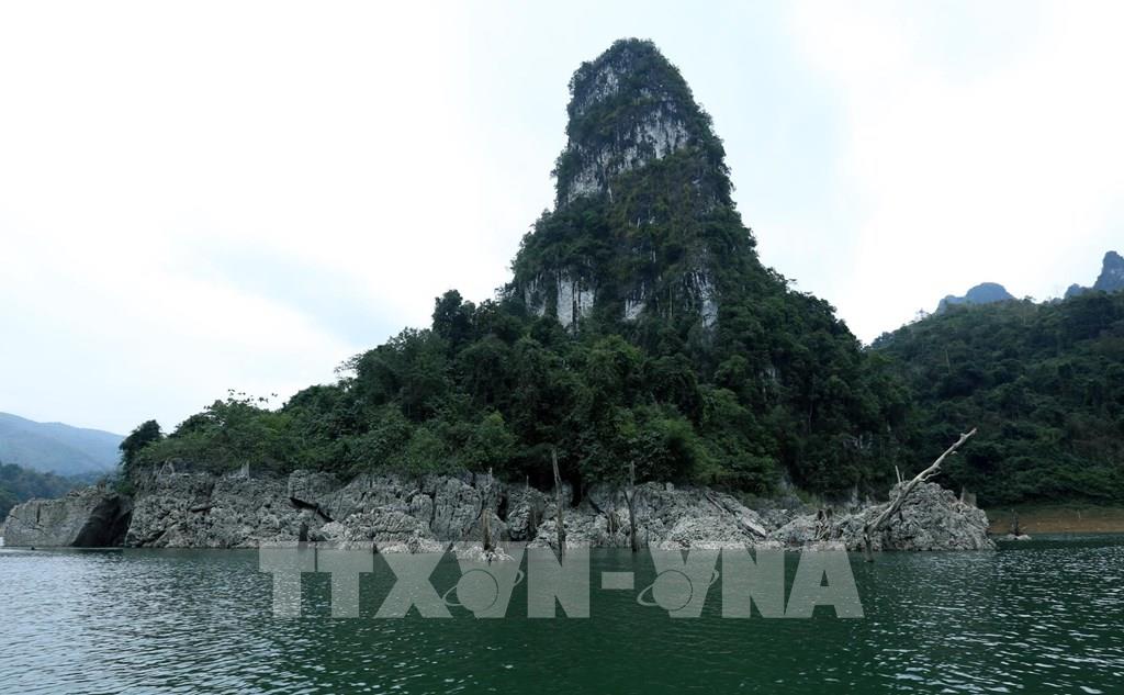 Vịnh Pá Khôm vào mùa khô mặt nước có màu trong xanh và phẳng lặng đan xen giữa núi rừng hùng vĩ của Tây Bắc tạo ra vẻ đẹp hoang sơ thuần khiết. Ảnh: Quý Trung – TTXVN