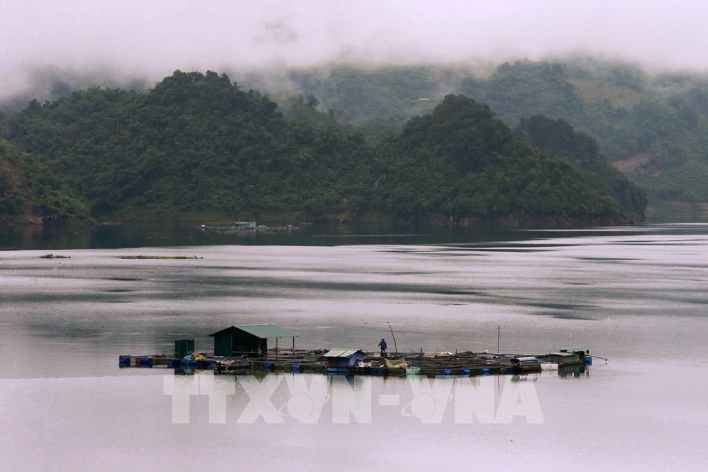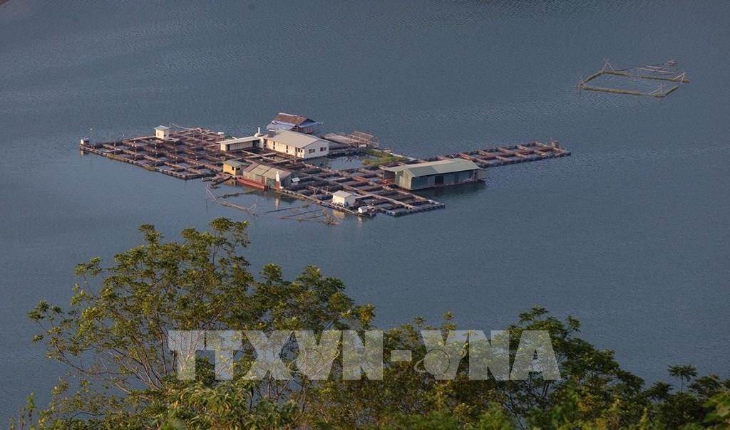 Những bè nuôi cá lồng nằm rải rác trên vùng hồ Hòa Bình mang lại những điểm xuyến cho không gian vốn đã đẹp lại càng thêm phần thơ mộng. Ảnh: Trọng Đạt-TTXVN