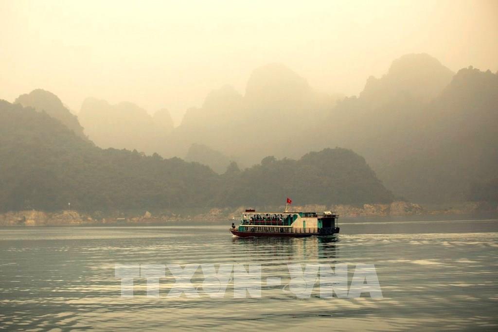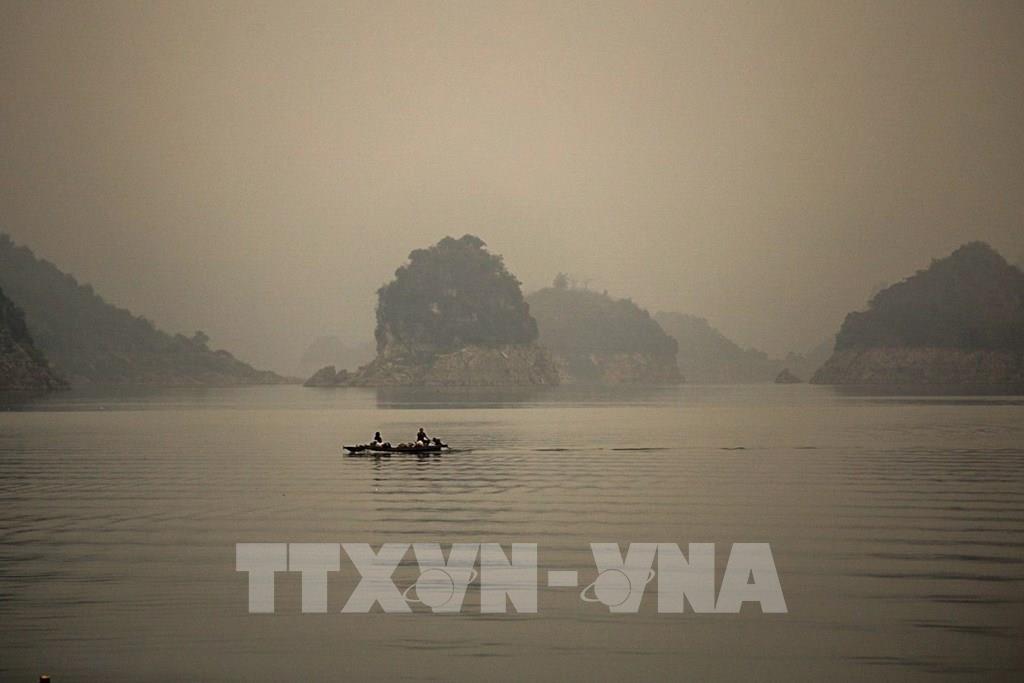 Cảnh quan sông núi lẩn khuất trong những màn sương mù mỏng và hoạt động của con người điểm xuyến tạo nên một bức tranh thủy mặc đầy thơ mộng. Ảnh: Trọng Đạt-TTXVN