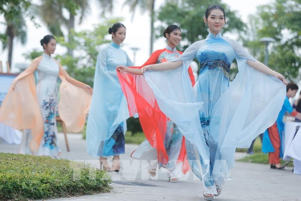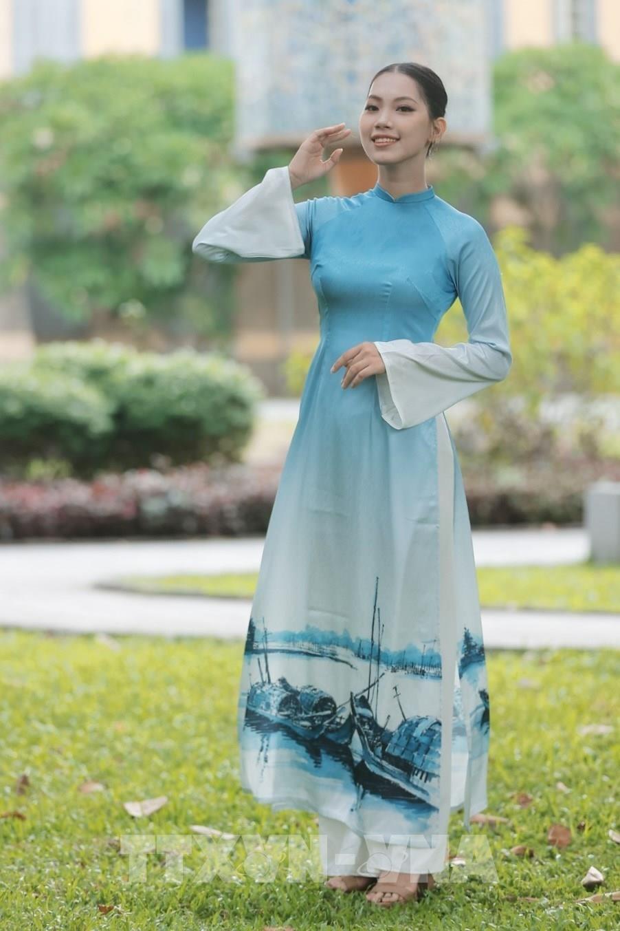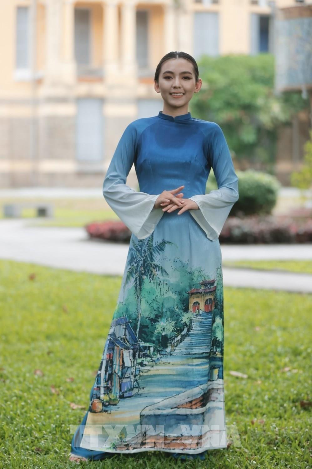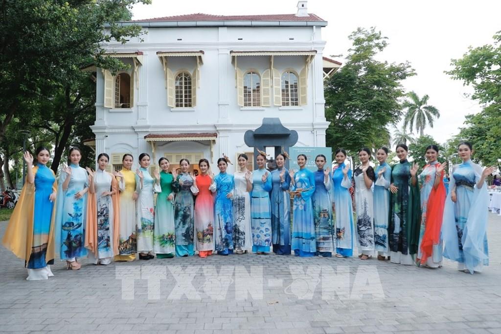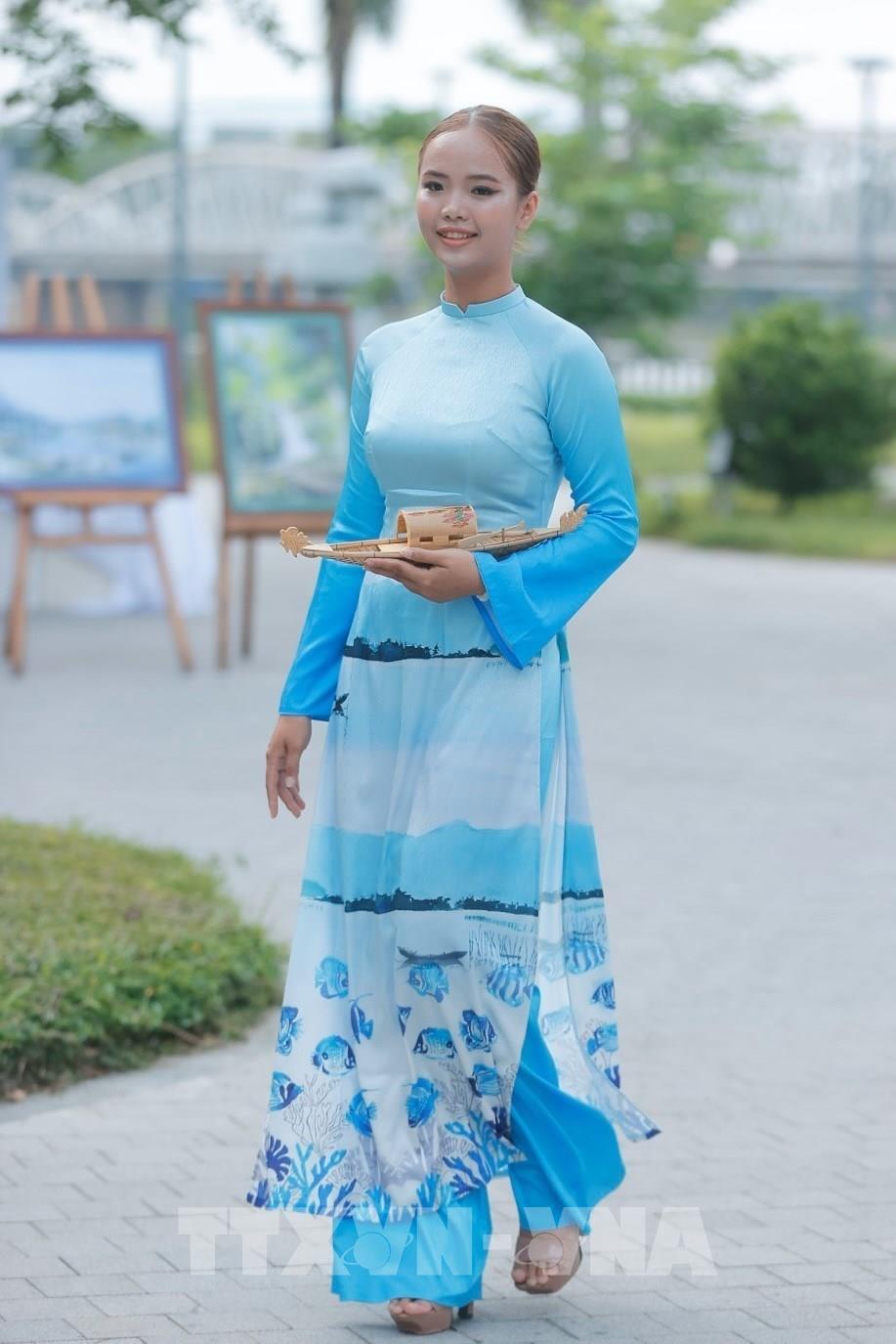 Bộ sưu tập áo dài của NTK Viết Bảo có sự kết hợp, sử dụng một số tác phẩm ký họa về Phú Lộc làm nền, góp phần bảo tồn, quảng bá, phát huy nét đẹp trang phục áo dài truyền thống. Ảnh: Minh Quyết - TTXVN
