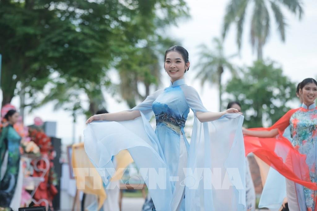Phần trình diễn áo dài của NTK Viết Bảo góp phần quảng bá vẻ đẹp thiên nhiên, thắng cảnh Huế. Ảnh: Minh Quyết - TTXVN