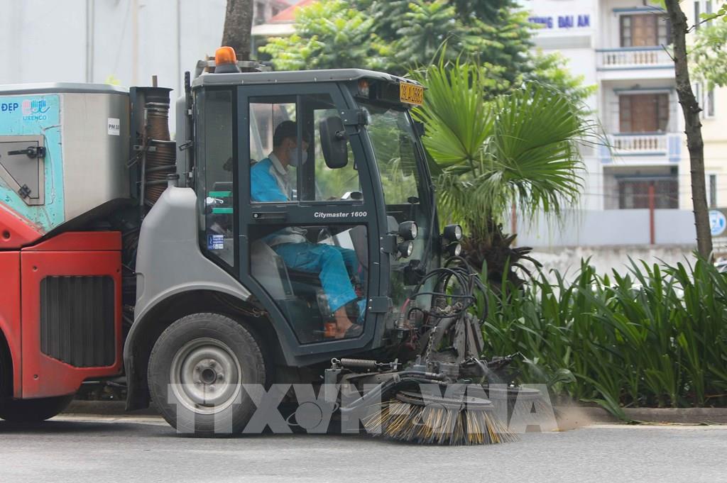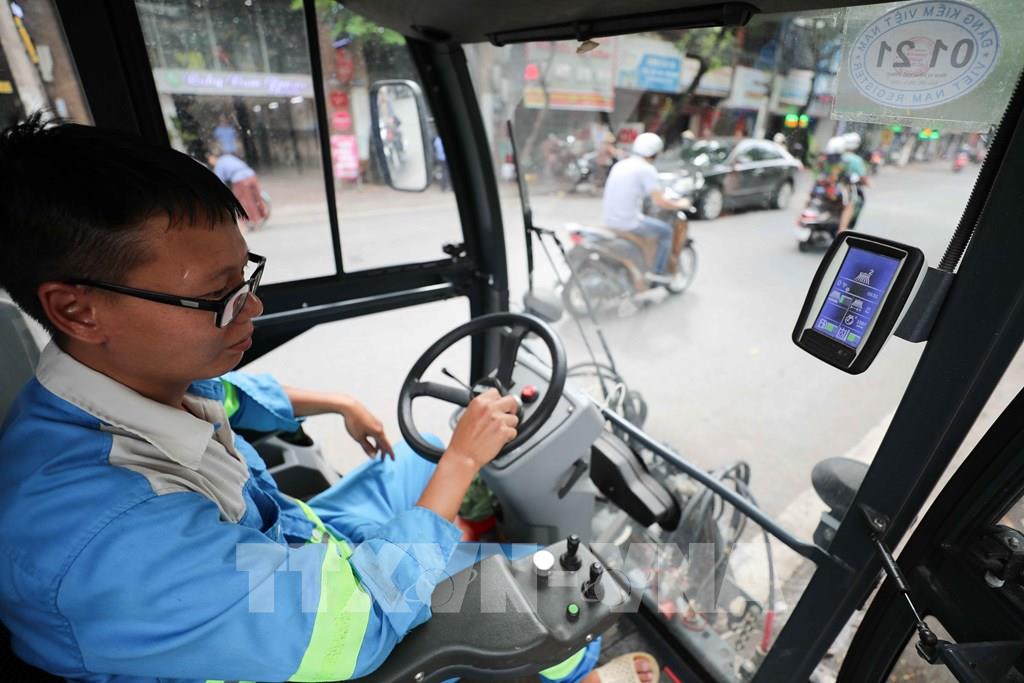 Công nhân của URENCO vận hành xe hút bụi, quét rác mini. Ảnh: Thanh Tùng - TTXVN