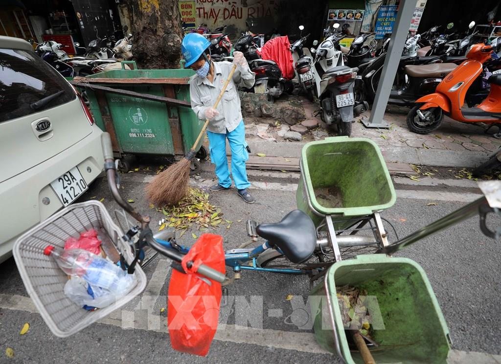 Với chiếc xe đạp và vật dụng quen thuộc (chổi, xẻng) người công nhân này đi sau các xe ô tô thu gom rác để làm sạch lần nữa nơi đặt các thùng rác trên phố. Ảnh: Thanh Tùng - TTXVN