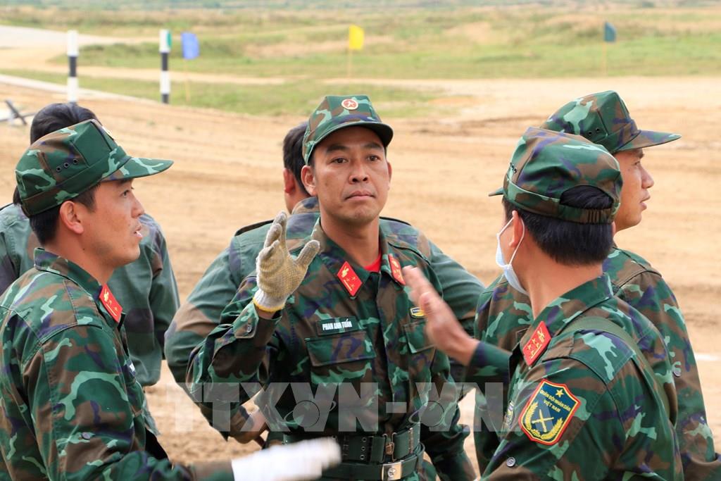 Pháo thủ Phan Anh Tuấn và các đồng đội bước vào bài thi với sự tự tin và quyết tâm cao. Kết quả, kíp xe số 3 tiêu diệt 5 mục tiêu bia, hoàn thành bài thi trong thời gian ngắn nhất so với tất cả các đội và mang về chiến thắng chung cuộc cho đội tuyển xe tăng Việt Nam. Ảnh: Trần Hiếu - Pv TTXVN tại Nga