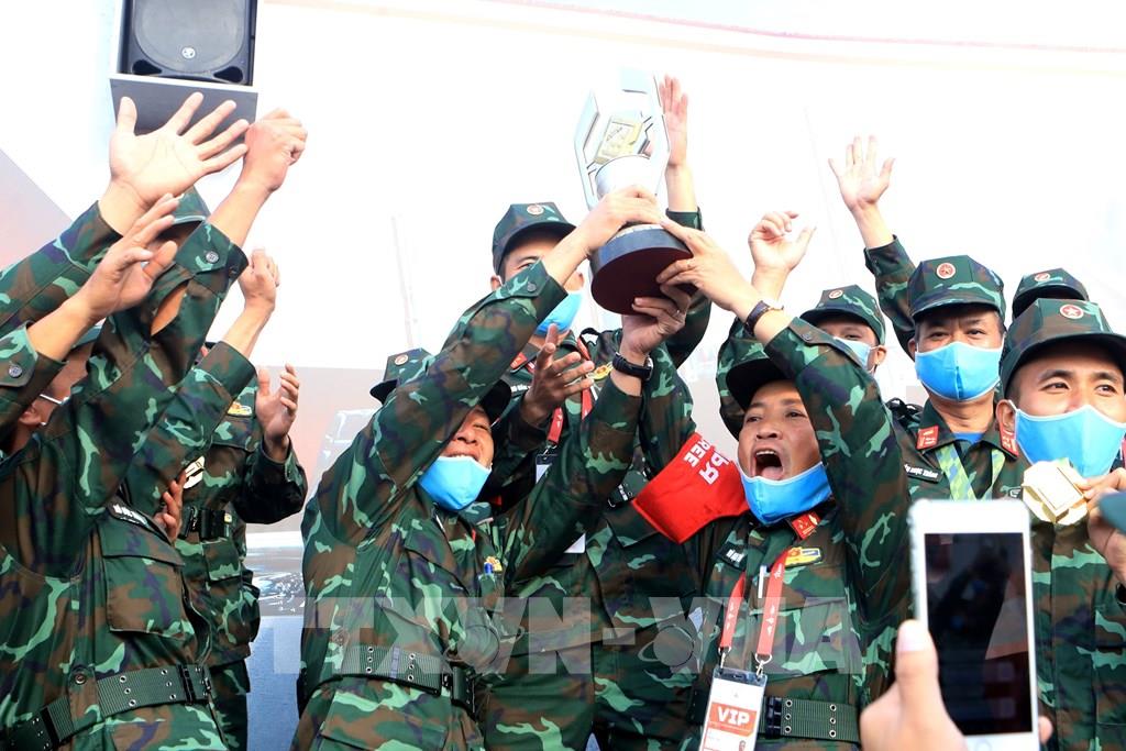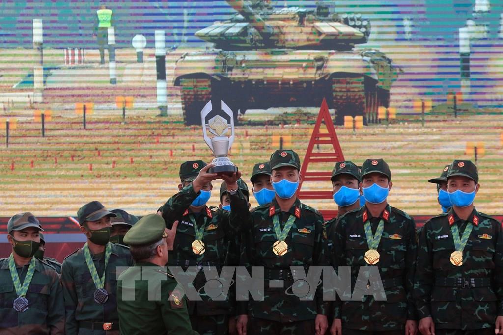 Đội tuyển Việt Nam về thứ nhất với thời gian 2 giờ 12 phút 42 giây, hạ 13/24 mục tiêu. Đứng thứ hai là đội tuyển Lào, vị trí thứ ba thuộc về đội tuyển Tajikistan. Chiều cùng ngày, Ban tổ chức đã trao huy chương vàng và Cúp luân lưu Tank Biathlon 2020 cho đội tuyển xe tăng Việt Nam. Ảnh: Trần Hiếu - Pv TTXVN tại Nga