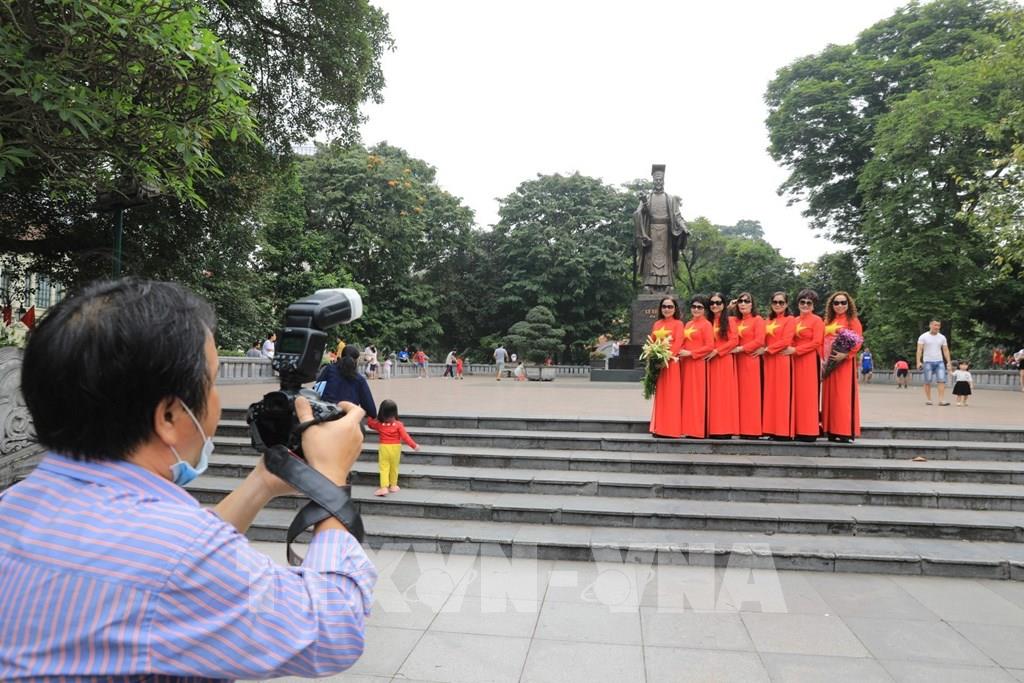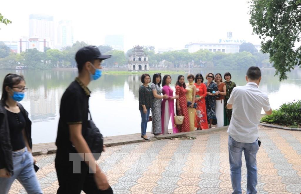 Tại khu vực Tượng đài Lý Thái Tổ người dân vui chơi chụp ảnh lưu niệm không đeo khẩu trang phòng chống dịch, sáng 30/4/2020. Ảnh: Thành Đạt - TTXVN
