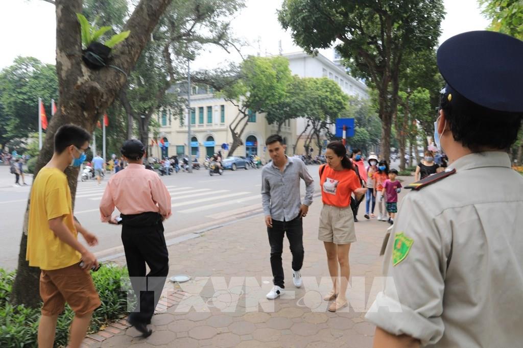 Lực lượng chức năng nhắc nhở người dân đeo khẩu trang tại khu vực Hồ Hoàn Kiếm nơi tập trung đông người, sáng 30/4/2020. Ảnh: Thành Đạt - TTXVN