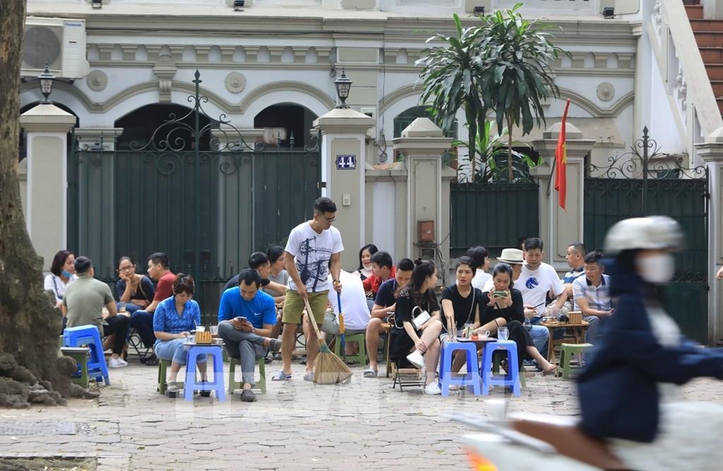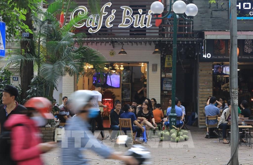 Các quán cà phê trên phố Phan Đình Phùng tụ tập đông khách không đảm bảo giãn khoảng cách cần thiết, sáng 30/4/2020. Ảnh: Thành Đạt - TTXVN