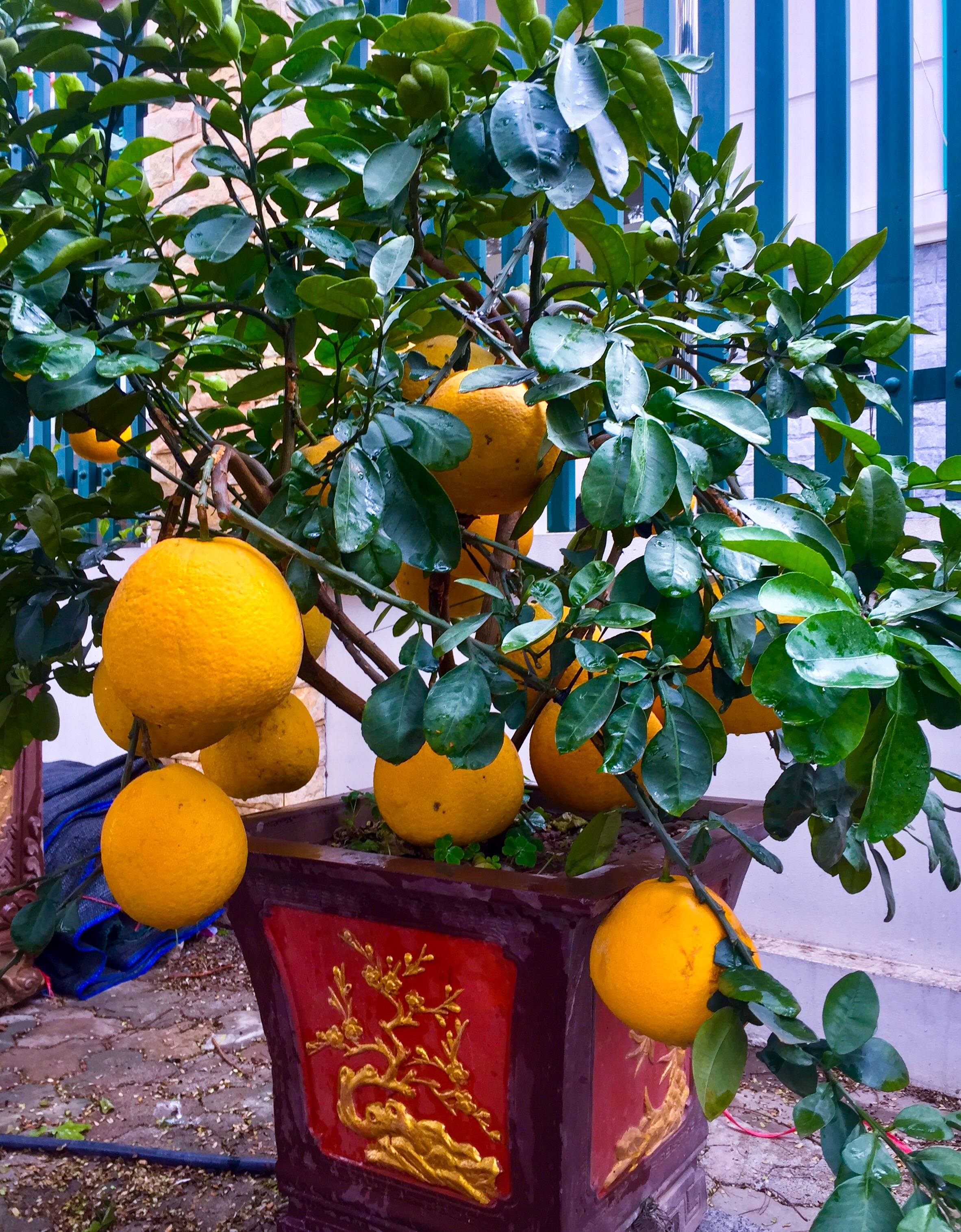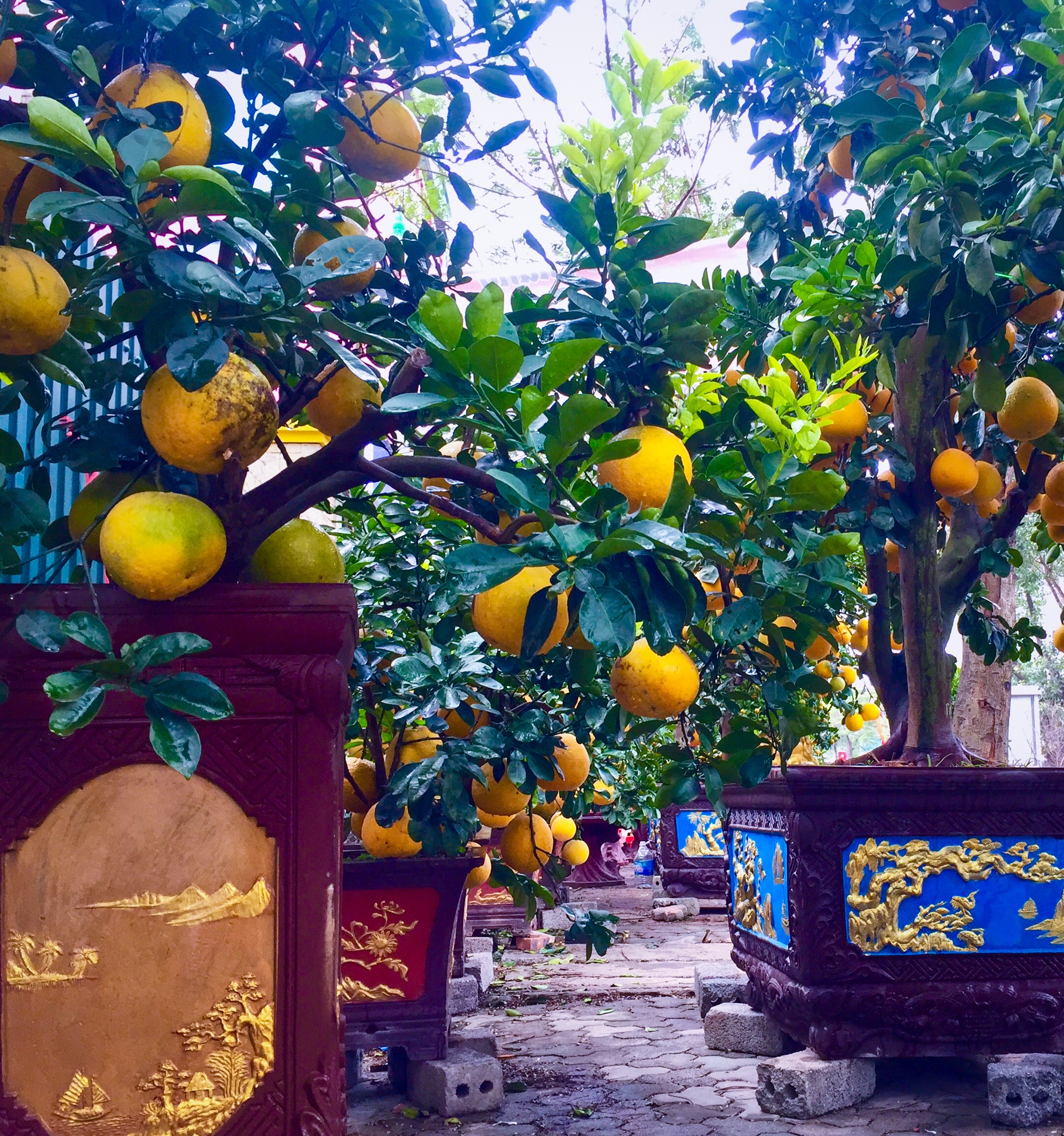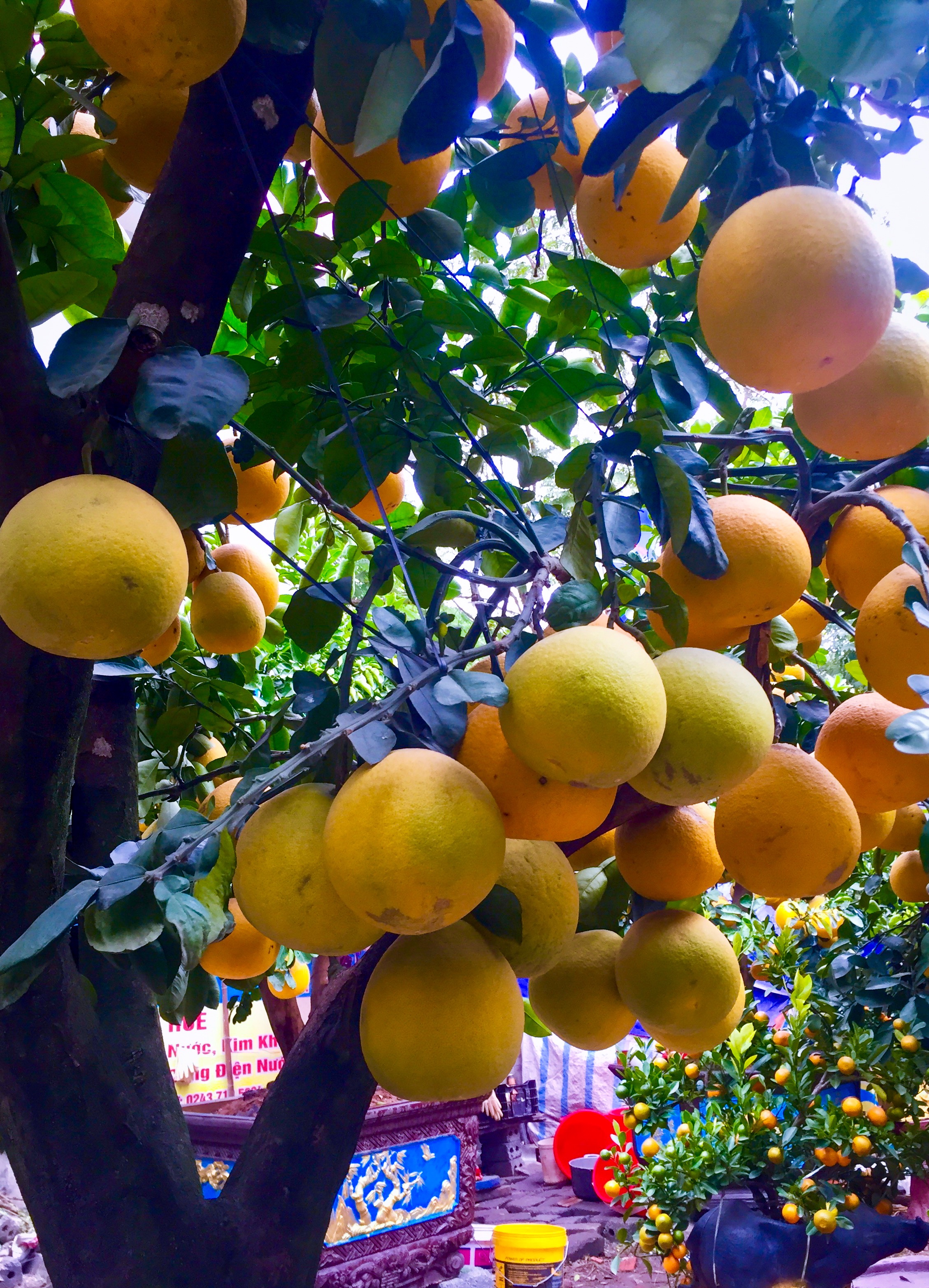 Bưởi cảnh phần quan trọng nhất là quả và lá cây, quả chín vàng đều, lá xanh mượt đa số được người mua lựa chọn. Ảnh: Đức Hạnh/BNEWS/TTXVN