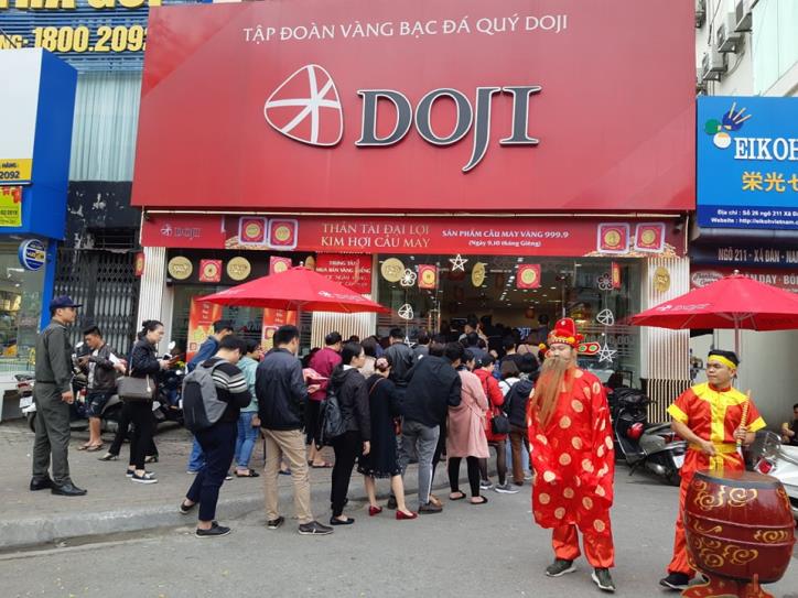 Người dân xếp hàng chờ mua vàng ngày vía Thần Tài. Ảnh: Thùy Linh/BNEWS/TTXVN