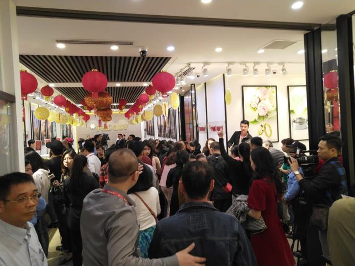 Không khí nhộn nhịp trước cửa vàng Phú Quý. Ảnh: Thùy Linh/BNEWS/TTXVN