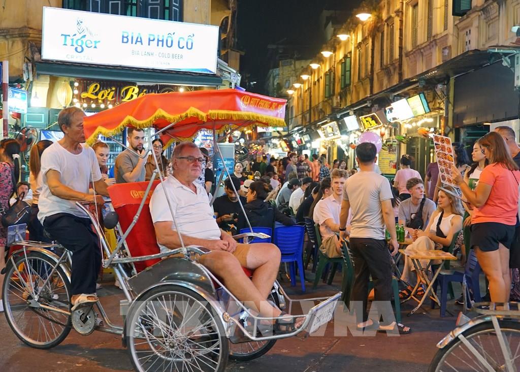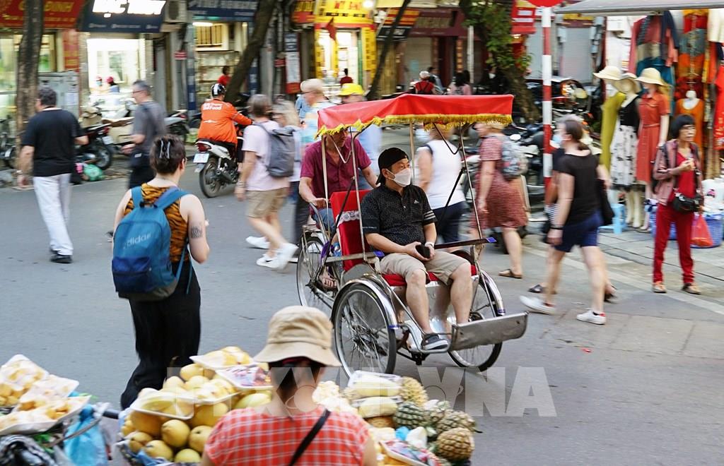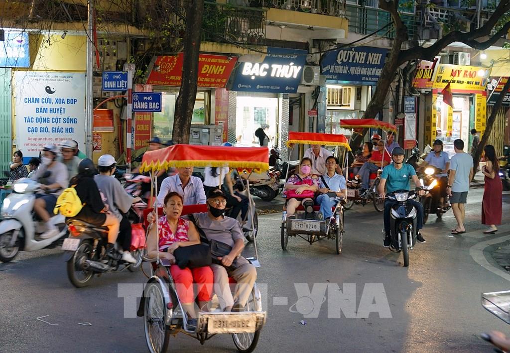 Du khách trải nghiệm tham quan đường phố Hà Nội bằng xích lô trên tuyến phố Hàng Bạc. Ảnh: Khánh Hòa - TTXVN