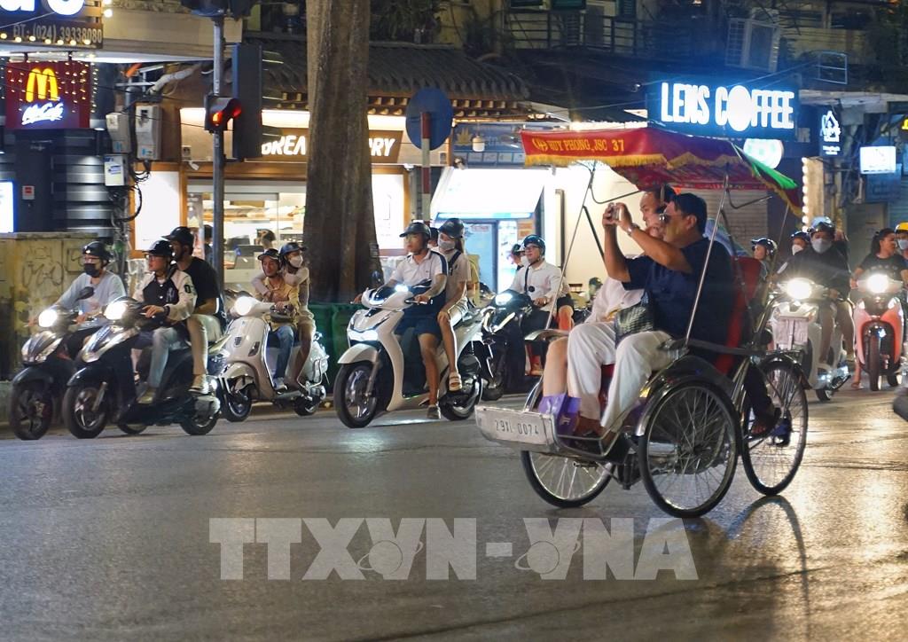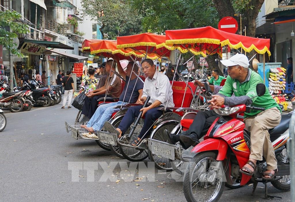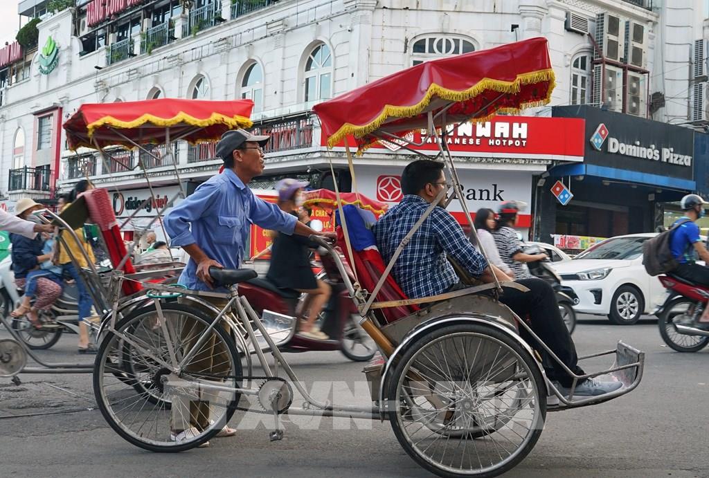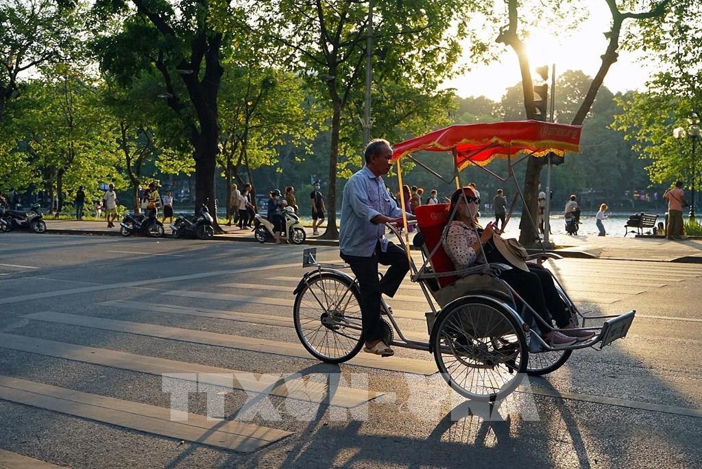 Du khách trải nghiệm du lịch quanh hồ Hoàn Kiếm bằng xích lô. Ảnh: Khánh Hòa - TTXVN