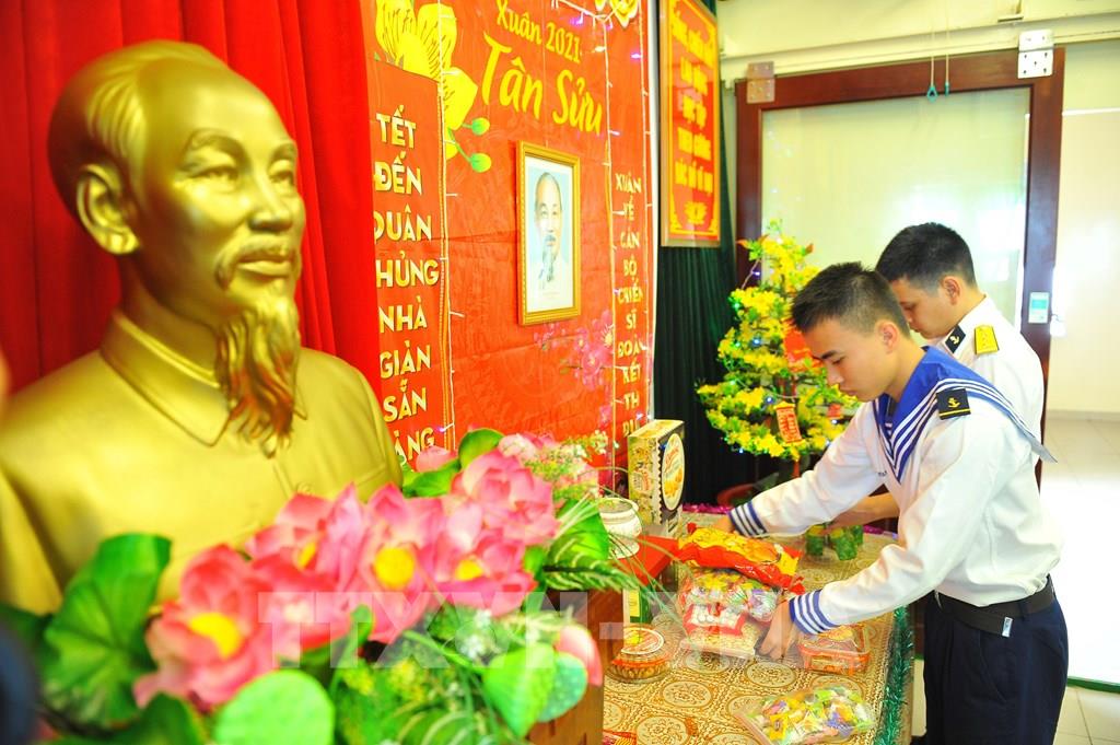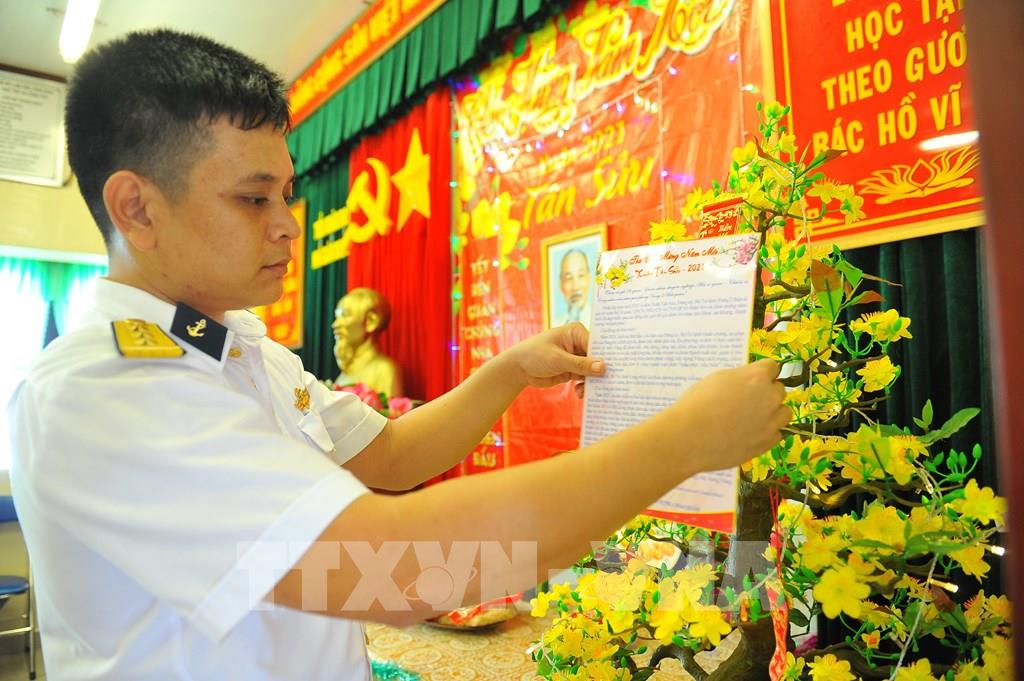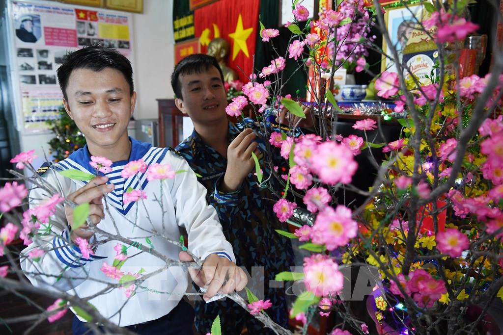 Các chiến sĩ nhà giàn DK1.10 trang trí Tết chào đón mùa xuân mới.Ảnh: Minh Đức - TTXVN