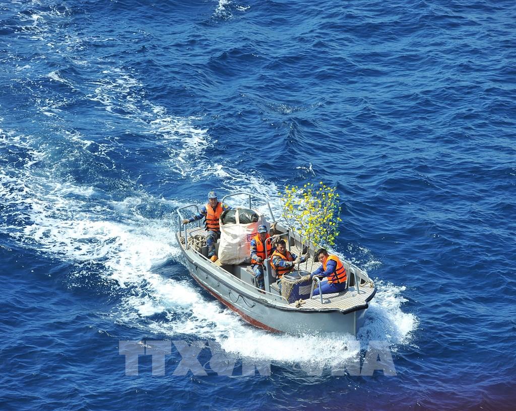 Những món quà từ mọi miền trên đất liền tới với các chiến sĩ nhà giàn mang hơi ấm, tình cảm để cán bộ, chiến sĩ nhà giàn đón Tết đầy đủ như trong đất liền. Ảnh: Minh Đức - TTXVN
