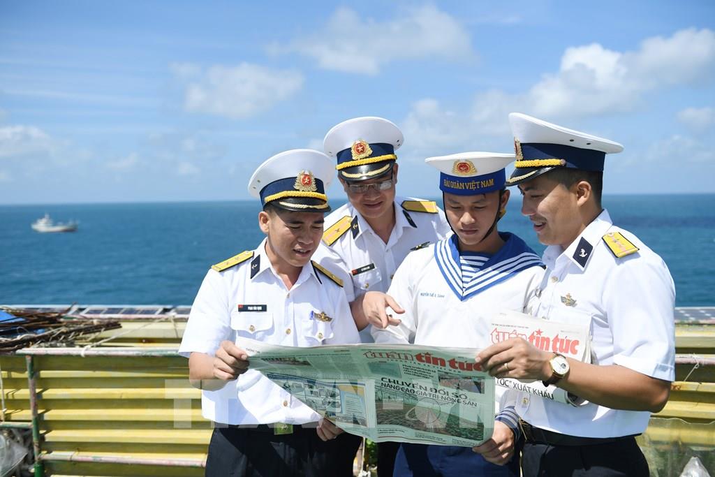 Các chiến sĩ nhà giàn DK1.10 với món ăn tinh thần là những tờ báo từ đất liền gửi ra. Ảnh: Minh Đức - TTXVN