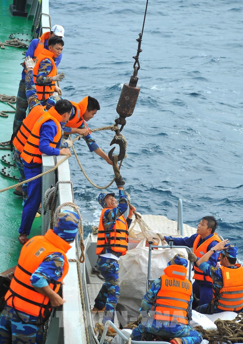 Cán bộ, chiến sĩ vận chuyển hàng Tết lên nhà giàn DK1/15. Ảnh: Minh Đức - TTXVN