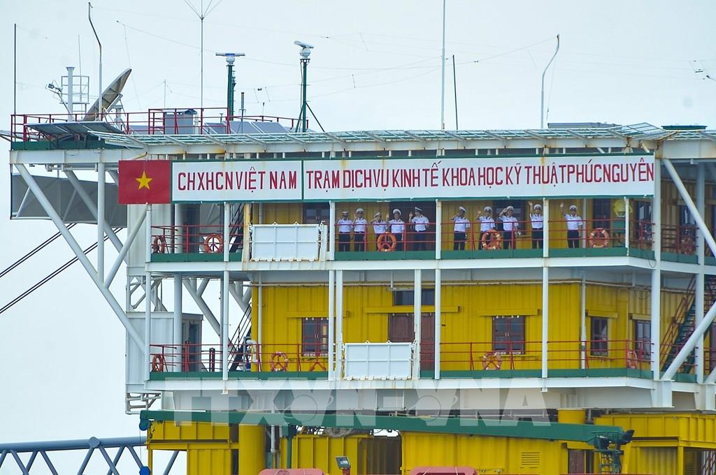 Các cán bộ, chiến sĩ nhà giàn DK1/15 vẫy tay chào đoàn công tác từ nhà giàn. Ảnh: Minh Đức - TTXVN