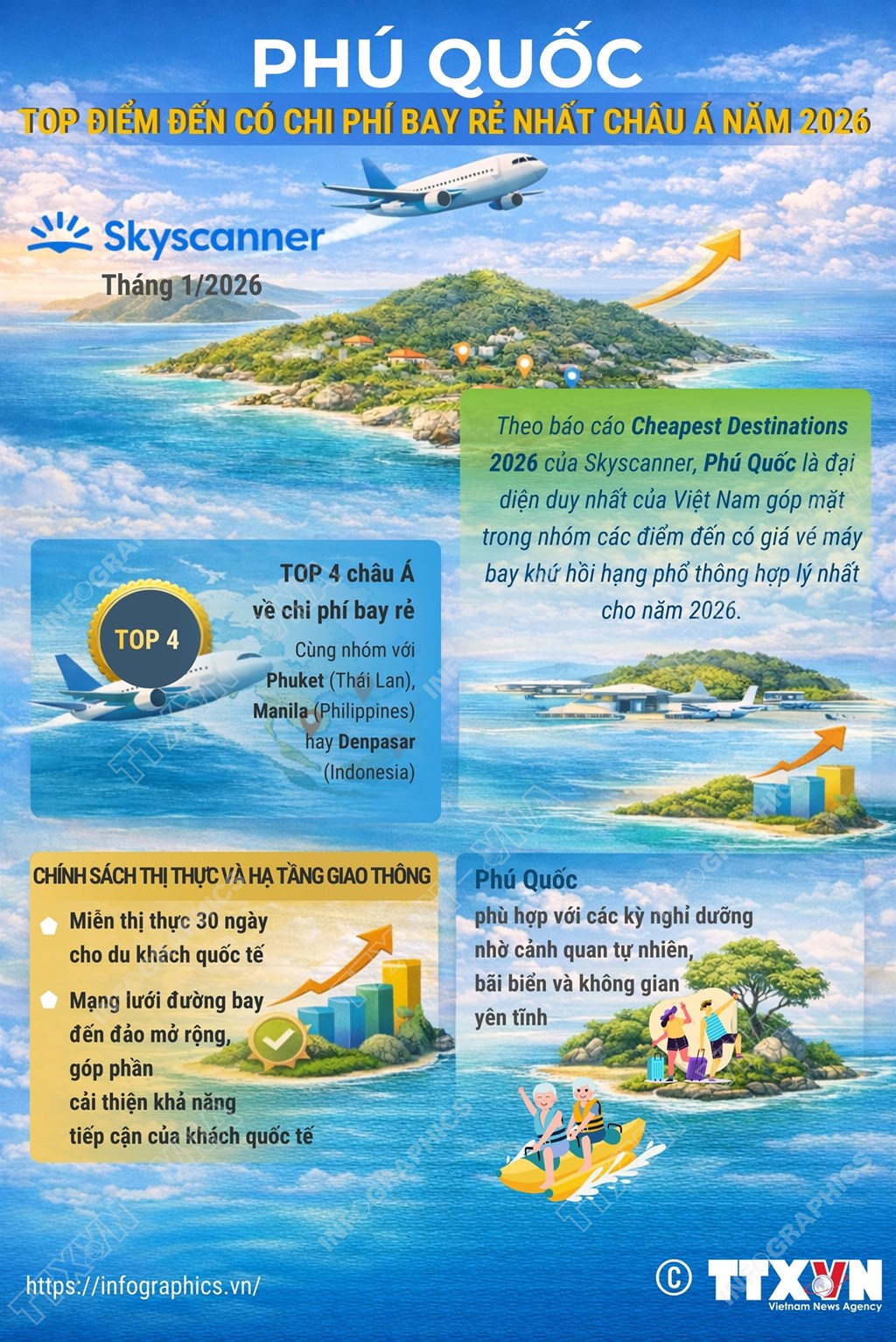 Phú Quốc lọt top điểm đến có chi phí bay rẻ nhất châu Á năm 2026. Ảnh: infographics.vn