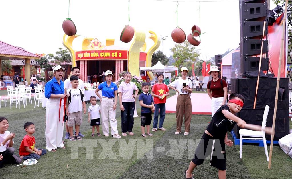 Các em bé tham gia trò chơi đập niêu trong không gian Hội trại văn hóa tại Khu Di tích lịch sử Đền Hùng. Ảnh: Hoàng Hùng – TTXVN