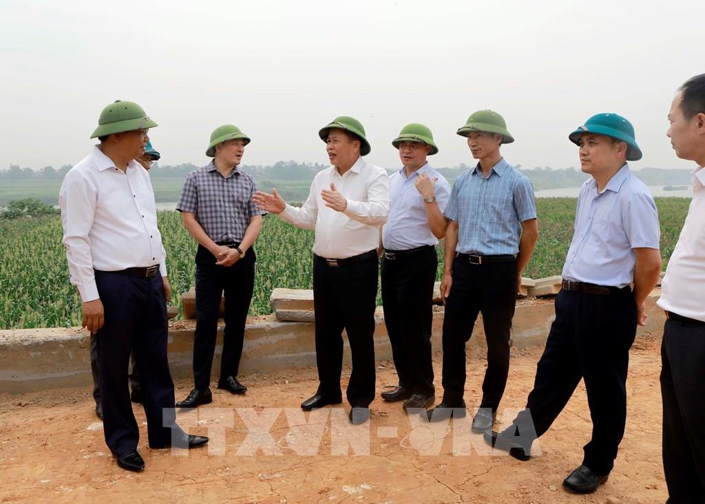 Phó Chủ tịch UBND tỉnh Phú Thọ Đinh Công Sứ (thứ 3 trái sang) kiểm tra Dự án cải tạo, nâng cấp, gia cố, xử lý các vị trí xung yếu trên tuyến đê tả sông Lô và các tuyến đê tả, hữu sông Phó Đáy. Ảnh: Hoàng Hùng - TTXVN ;